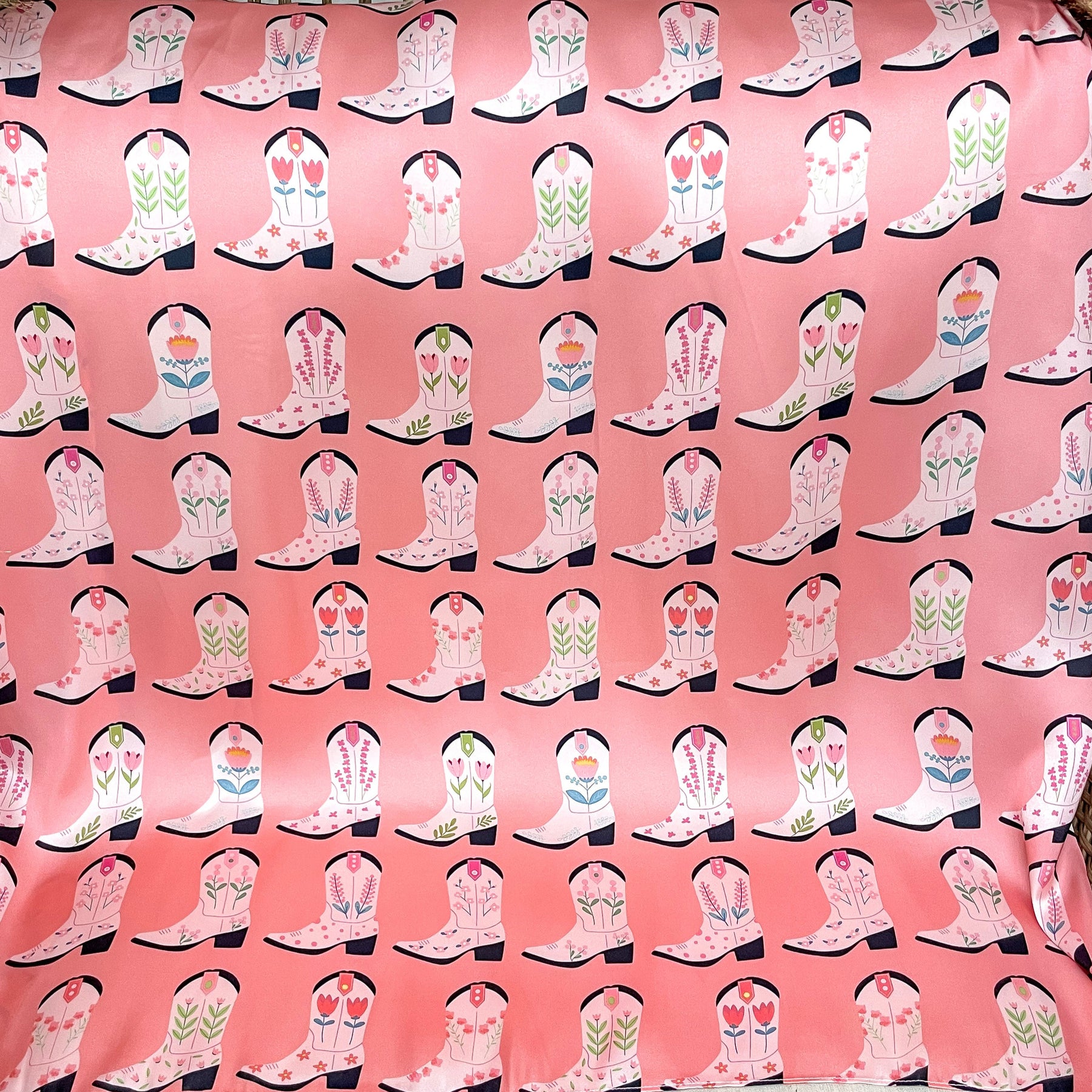 Add a touch of western charm to your outfit with our Boot Scootin Floral Wild Rag in Pink. This vibrant pink wild rag is adorned with white boots and a variety of colorful floral patterns, making it a statement piece for each and every cowgirl!