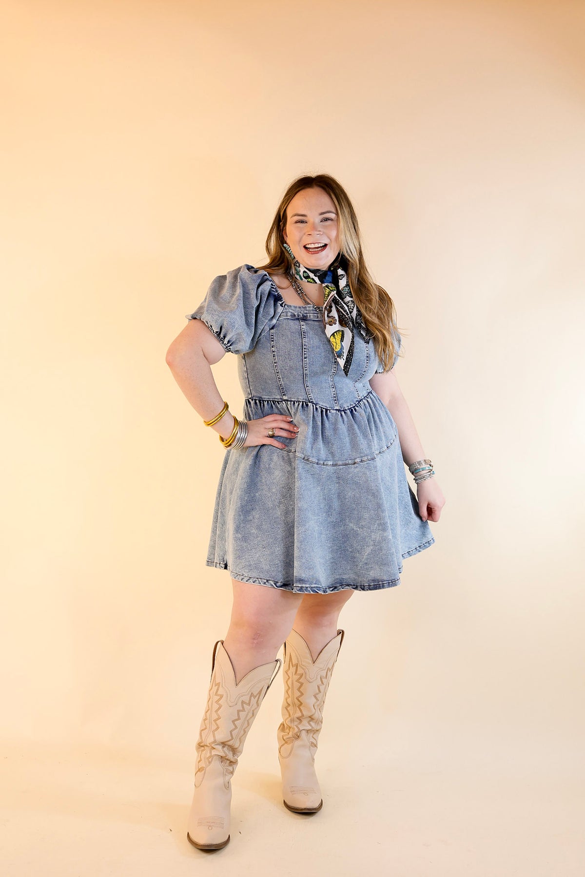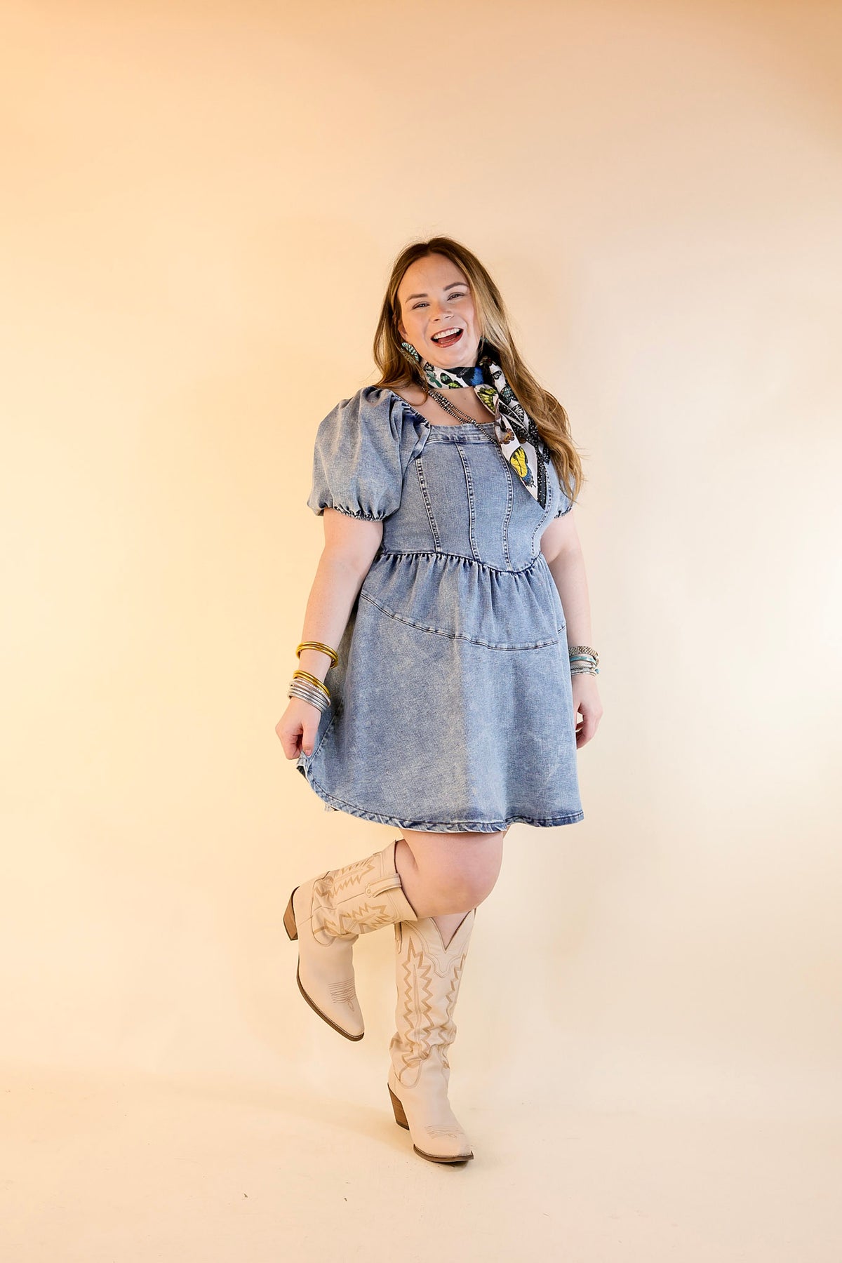 Denim Delight Babydoll Dress with Puff Sleeves in Medium Wash