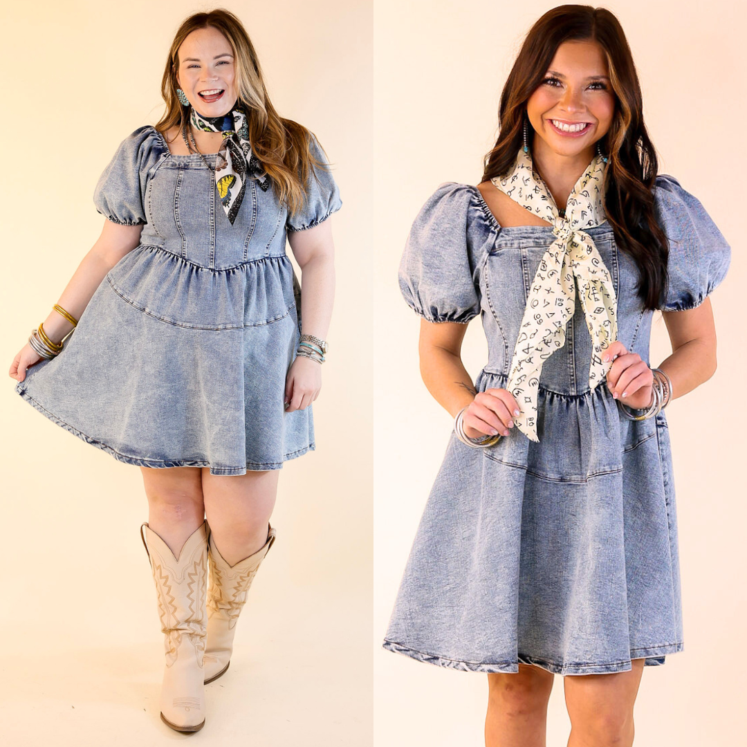 Discover the perfect blend of comfort and style with the Denim Delight dress. This short denim dress features a flattering square neckline and adorable puff sleeves that add a playful, feminine touch to your look. Ideal for casual outings or dressed up with accessories, this versatile dress is a must-have in every fashion-forward wardrobe. Crafted from soft, durable denim, it offers both ease of movement and timeless appeal.
