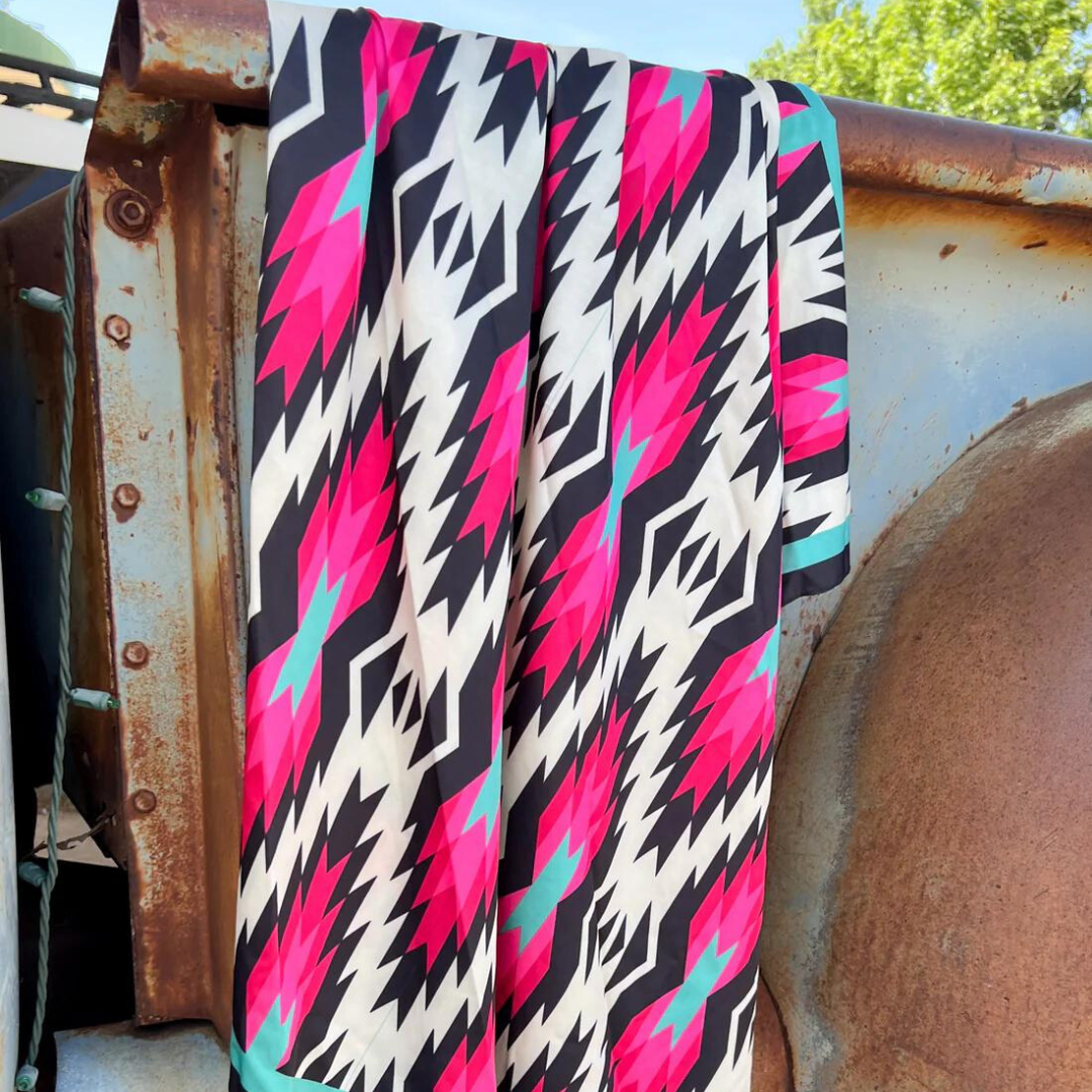 Add some western to your outfit with The Jacksboro Wild Rag/Scarf! This rag has a bright aztec print with pinks, turquoise, black & cream. This versatile accessory can be worn as a top, in your hair, on your bag AND so many other ways!