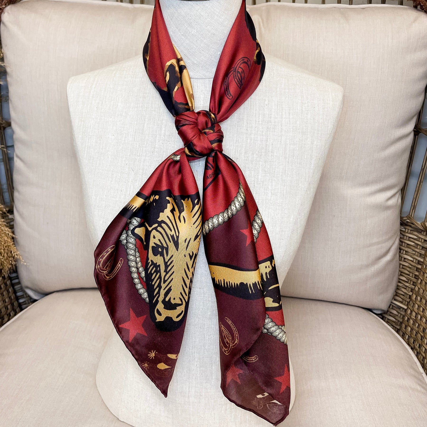 Add a pop of Western flair to your look with this bold red NFR graphic wild rag. Featuring iconic bucking bronco and classic Western details, this versatile scarf is designed to go wherever you do. Wear it around your neck, tie it in your hair, or add it to your bag for an effortless touch of rodeo-inspired style.