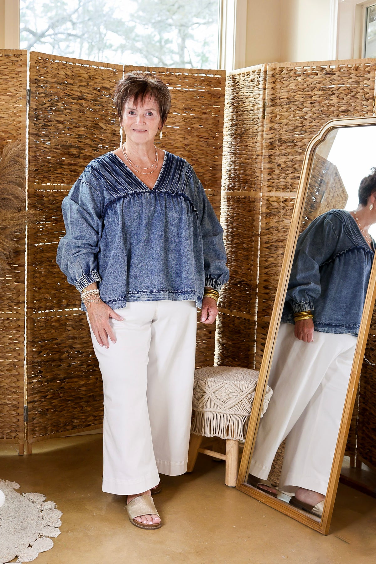 Western Soul Long Sleeve V Neck Denim Top in Medium Wash