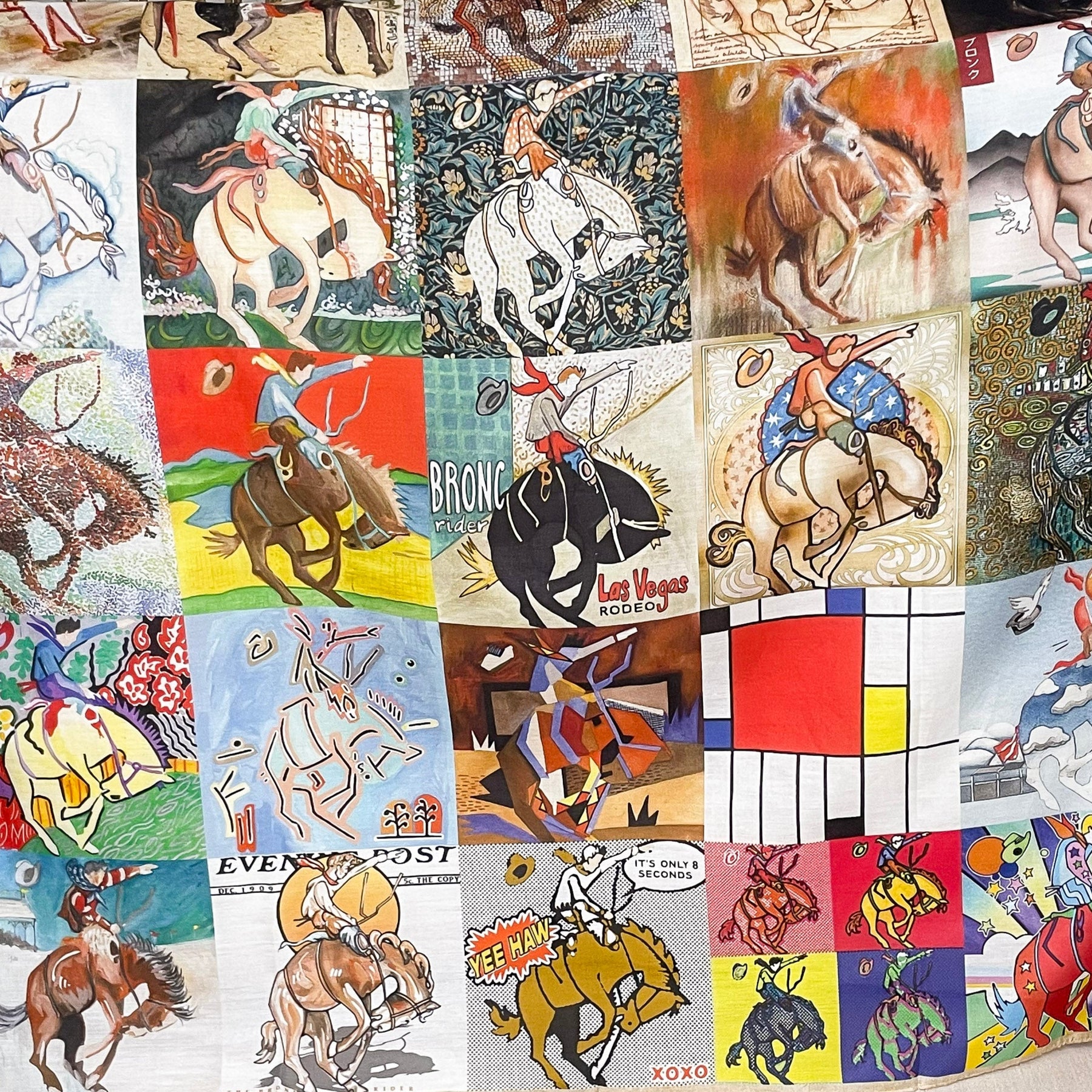 The Bronc Study wild rag is a true artistic masterpiece, handcrafted in Texas by a mother-daughter duo. This unique design features 25 squares, each depicting the same cowboy riding a bronc—but in a completely different artistic style. From bold comic book lines to delicate watercolor strokes, intricate dot work to abstract shapes, every square is inspired by famous artists, creating a striking patchwork of creativity. Made from high-quality fabric, this wild rag is perfect for adding an artsy Western touch to any outfit—whether worn around your neck, in your hair, or tied to a favorite bag. Bronc Study is more than an accessory; it’s a celebration of art, movement, and the untamed spirit of the West.