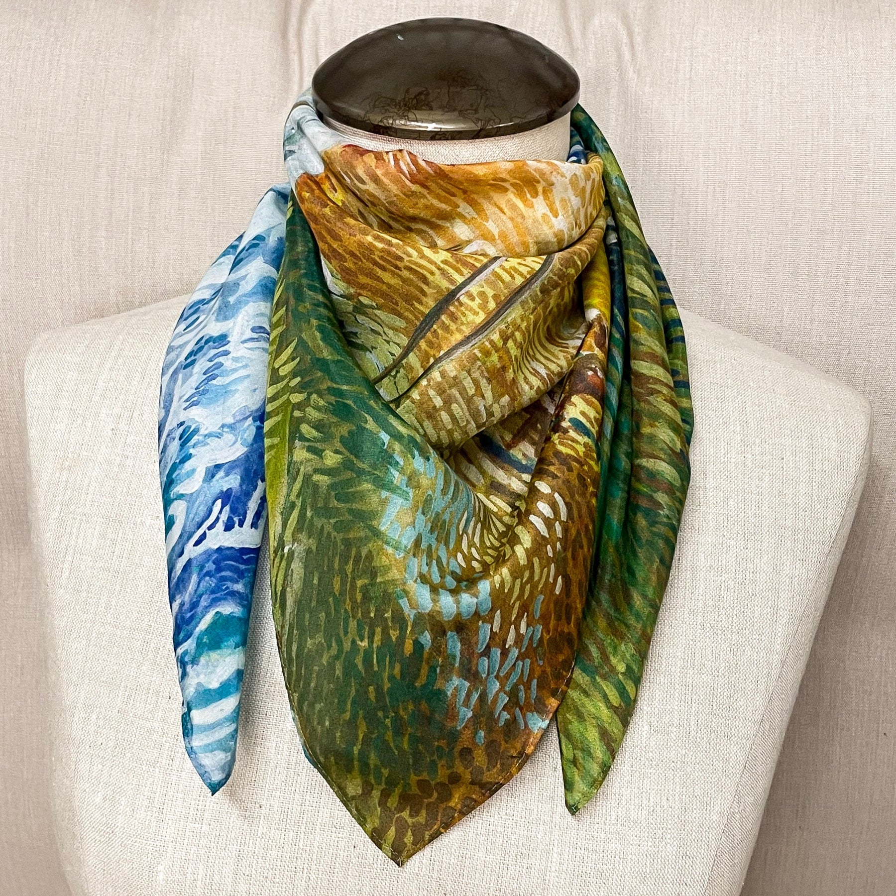 The Home on the Range wild rag is a true work of art, designed and handcrafted in Texas by a talented mother-daughter duo. Made with care and attention to detail, this piece beautifully captures the essence of the open range with a breathtaking scene of a cowboy and his horse looking out over a vast field, where other horses roam freely. The rich blue sky, blade of grass, and muscle on the horse depicted in stunning detail. Made from luxurious, high-quality fabric, this wild rag is as functional as it is beautiful—perfect for wearing around your neck, in your hair, or tied to a favorite bag for a touch of Western charm.