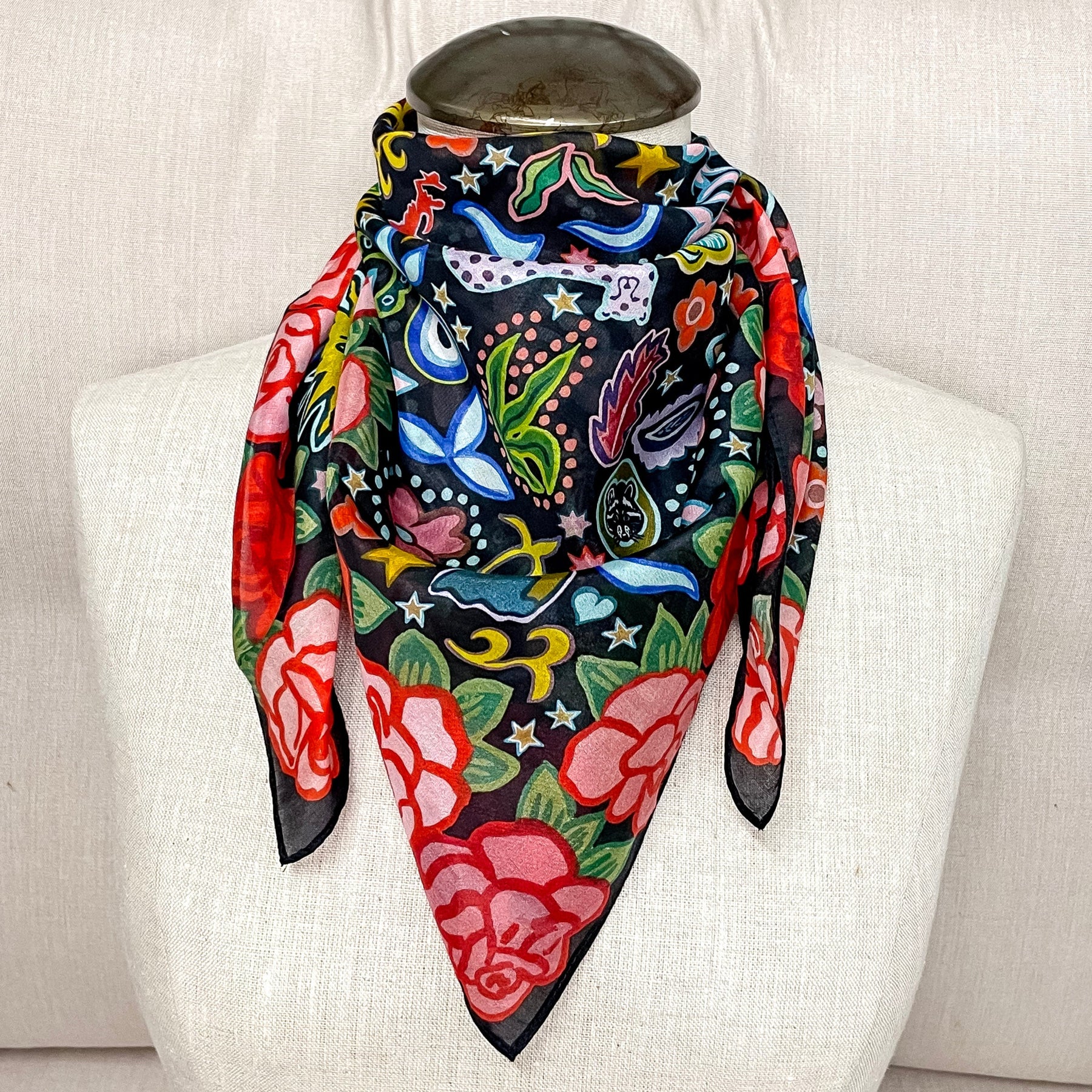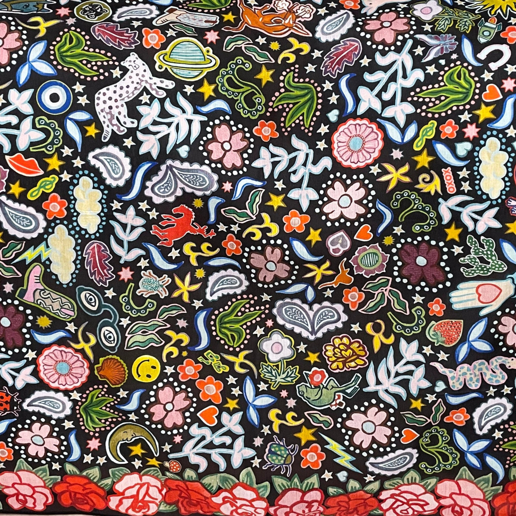 The Rose Ranch wild rag is a vibrant blend of Western charm and whimsical artistry, handcrafted in Texas by a mother-daughter duo. Framed by a stunning border of red and pink roses, this design bursts to life with an array of playful icons—delicate flowers, lush plants, curious animals, shimmering stars, glowing moons, and intricate shapes, all woven together in a colorful, enchanting pattern. Made from high-quality fabric, it’s the perfect statement piece to wear around your neck, in your hair, or tied to a favorite bag. Rose Ranch is more than just a wild rag—it’s a celebration of nature, creativity, and the magic of the West.