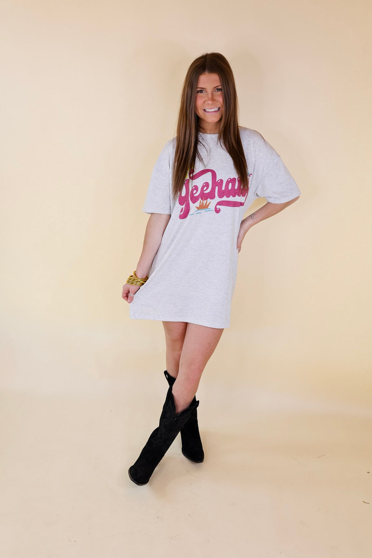 This graphic tee shirt dress is the perfect Western statement! It includes short sleeves, a crew neck, and a cactus graphic that says "YeeHaw" in pink Dress it up with boots and Navajo jewelry, or go casual with sneakers! Arté is wearing a size small.