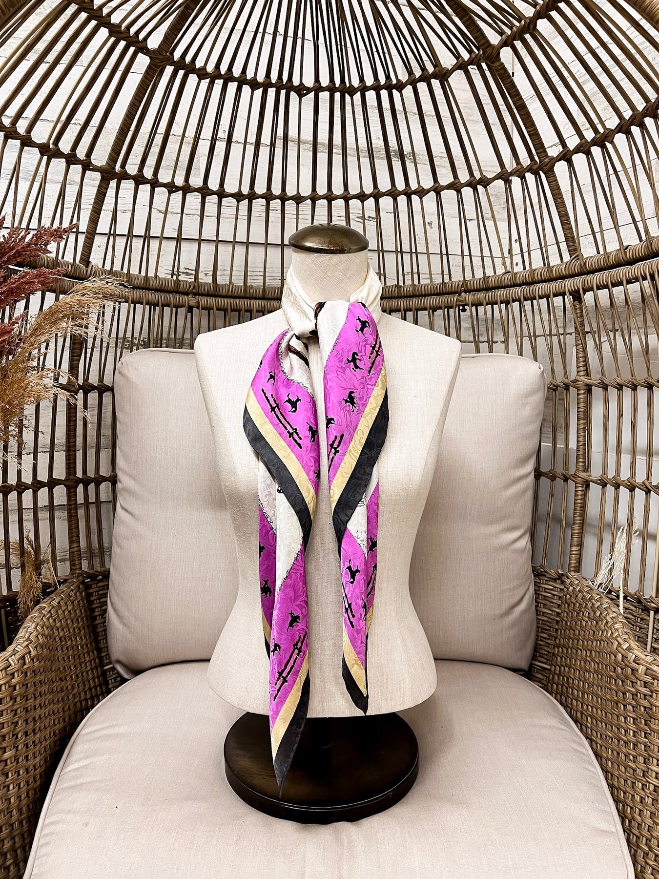 The Fences Silk Wild Rag in Ivory by Wyoming Traders offers a refined take on a classic Western story. Featuring the iconic fence motif paired with traditional western imagery, this design is set against a warm ivory backdrop with rich contrast details that give it an heirloom-quality feel.