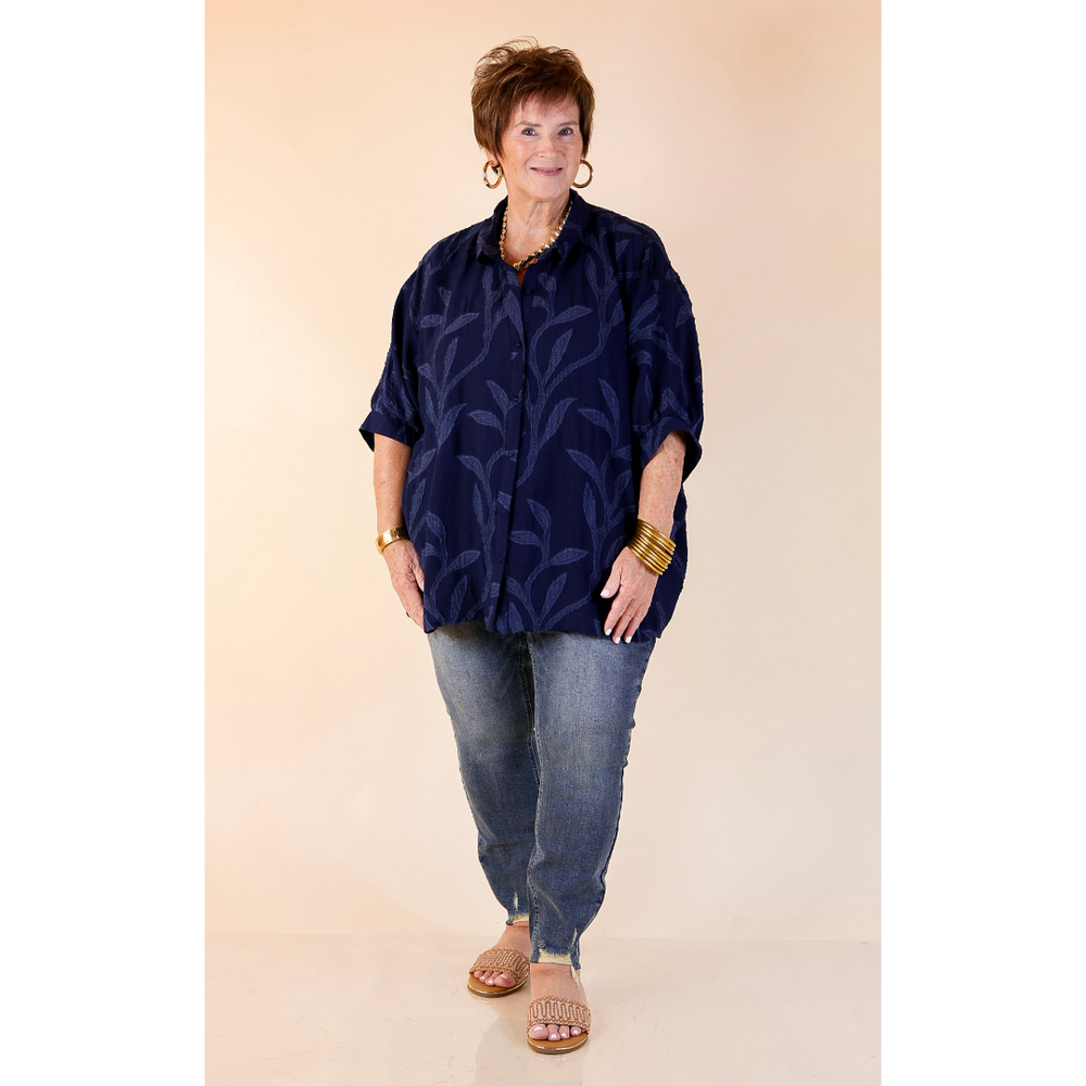 Flirty in Floral Textured Floral Print Button Up Collared Blouse in Navy Blue