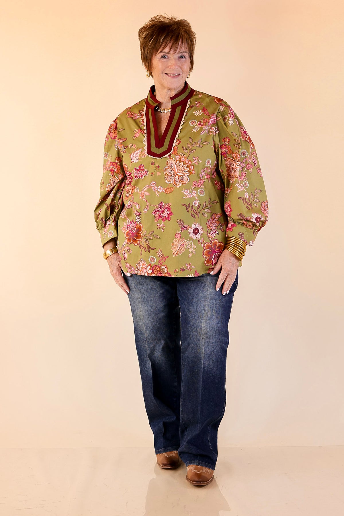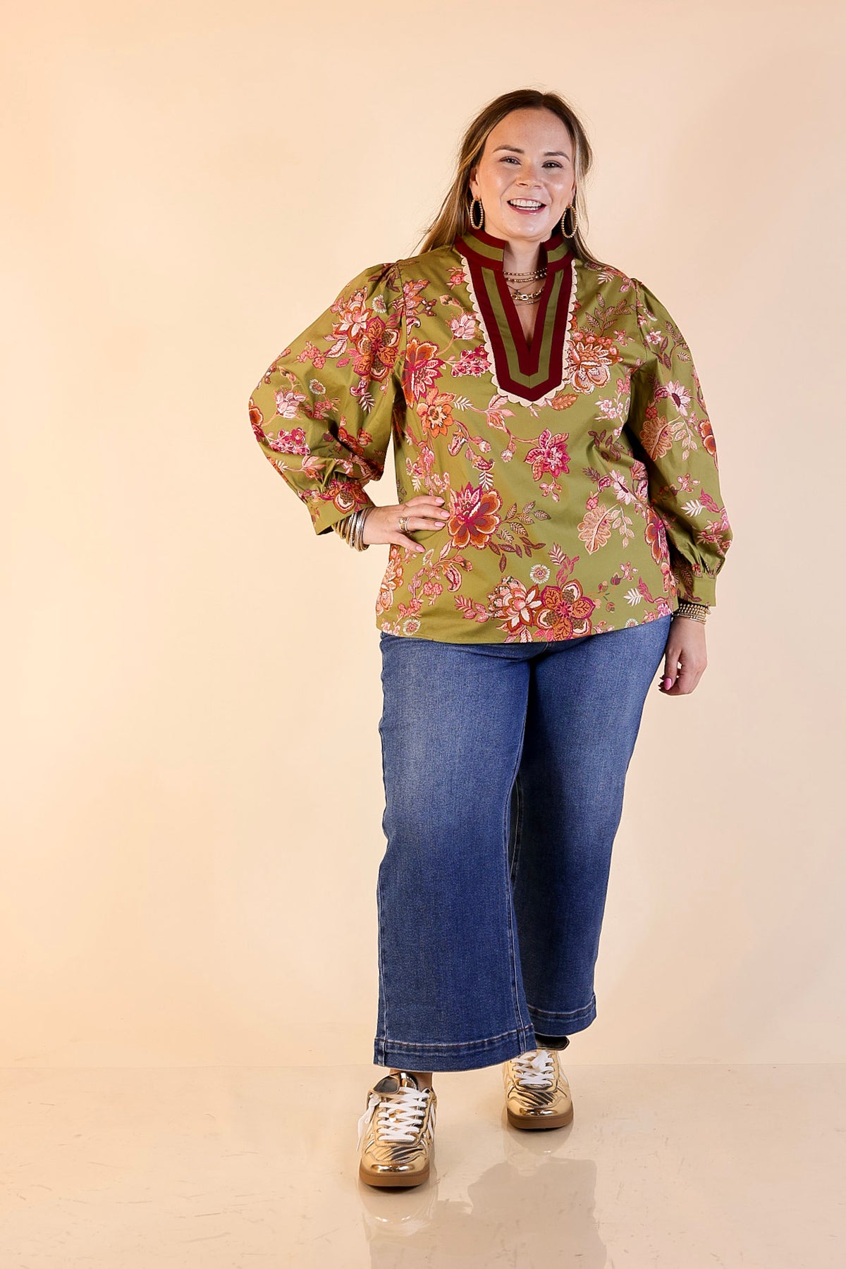 The Autumn Allure Floral Long Sleeve Top in Olive is everything we love about effortless fall style — bold florals, soft structure, and elevated detail. Featuring a rich olive backdrop with a mix of burgundy and pink blooms, this top stands out with its contrast neckline and gathered sleeves. The relaxed silhouette keeps it comfortable while still polished enough for work, dinner, or weekend outings. Pair it with denim or trousers and let the color combo do the talking — this one’s a seasonal showstopper.