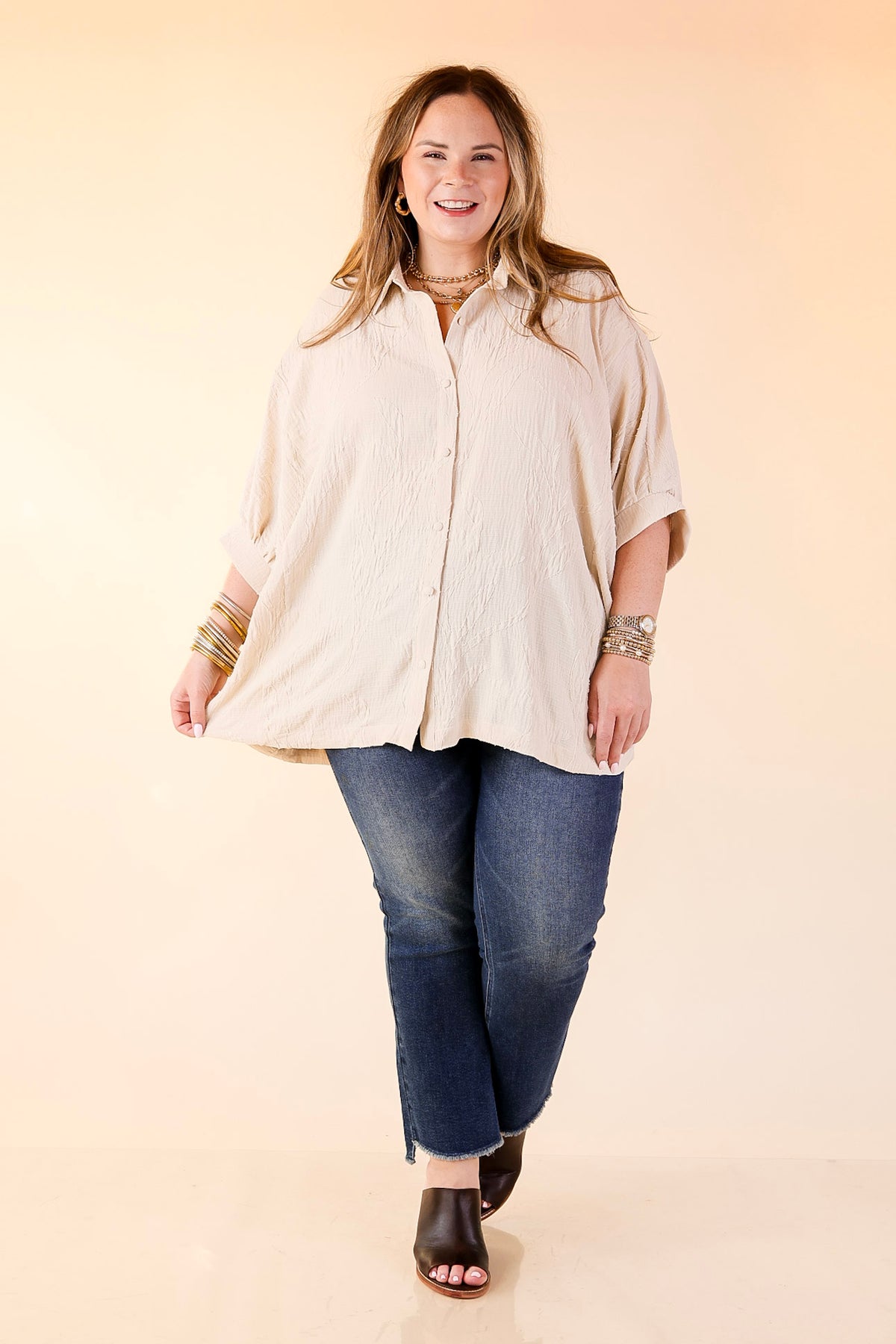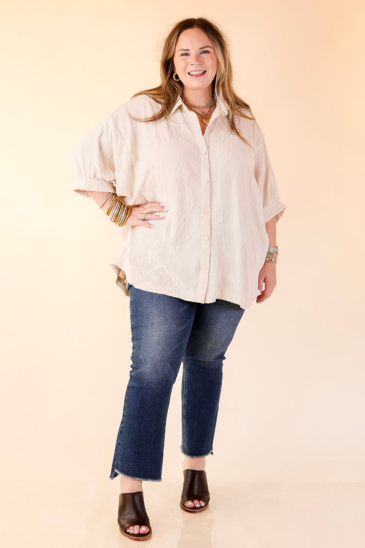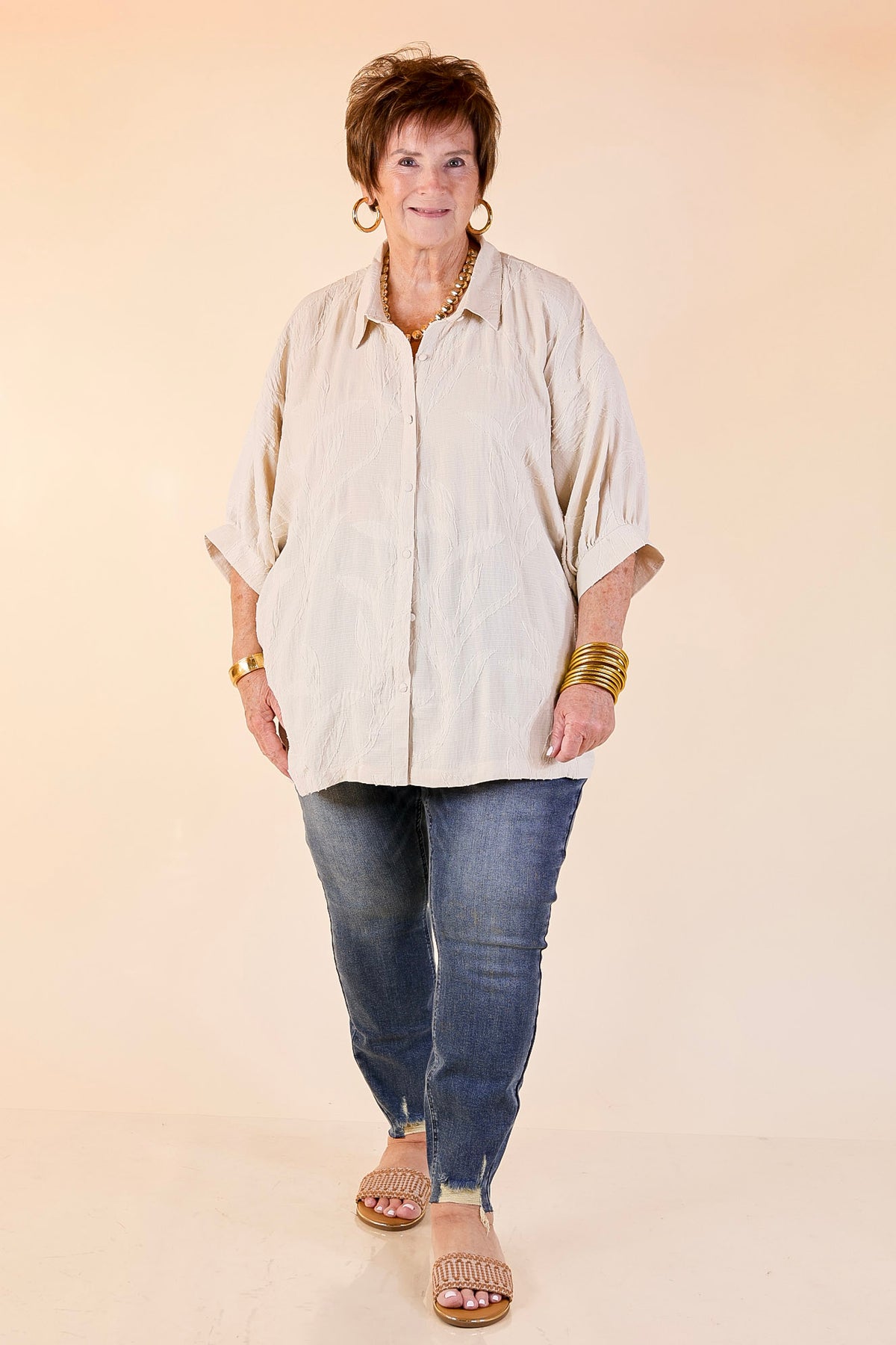 The Flirty in Floral Oversized Textured Button Down Top in Cream is where playful charm meets polished ease. Featuring a relaxed oversized fit and lightweight woven fabric, this top is elevated with a dimensional floral texture that adds just the right amount of detail. The button down front and collared neckline keep the look timeless, while the breezy fabric makes it a perfect choice for year-round wear. Style it with denim for casual days, or pair with sleek trousers for an effortless office-to-evening transition.