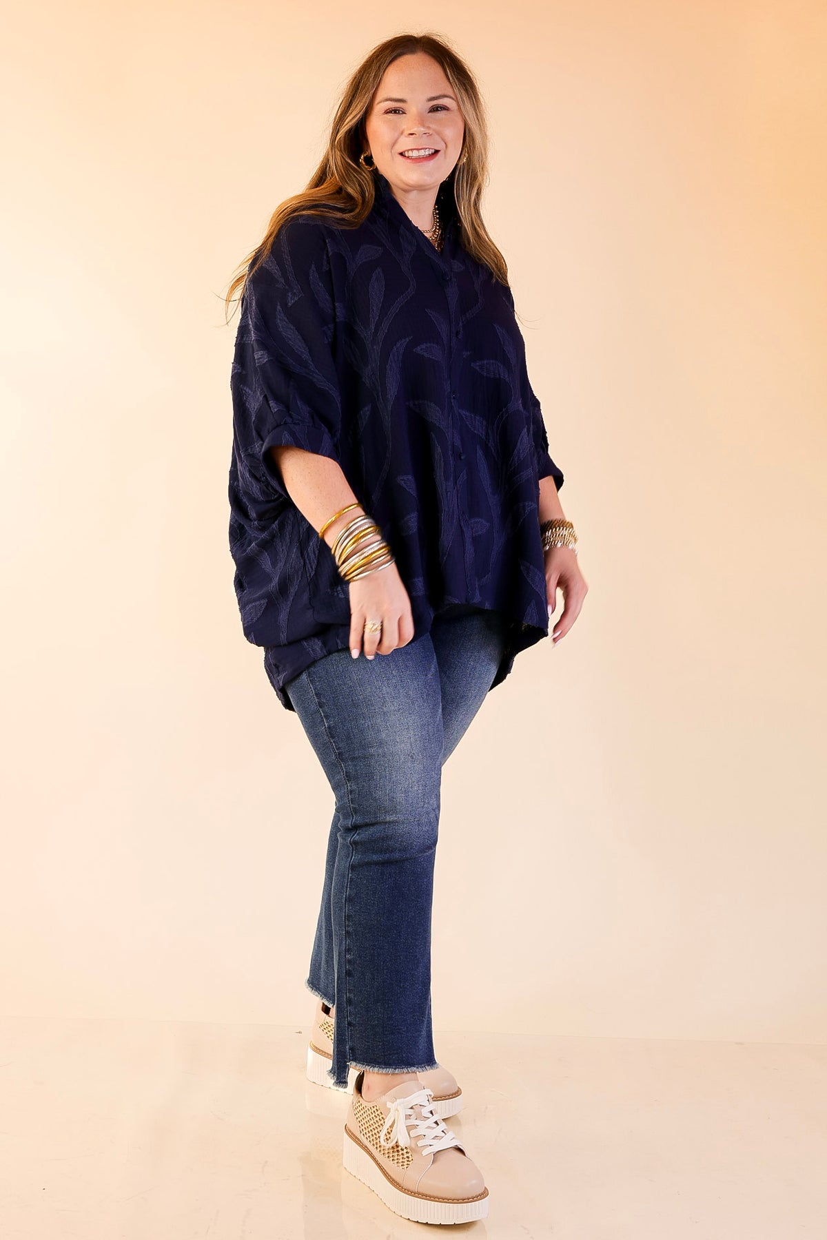 The Flirty in Floral Oversized Textured Button Down Top in Navy is a playful twist on polished style. Designed with a relaxed oversized fit, this lightweight woven top features a dimensional floral texture that adds subtle charm without being over the top. The button down front and collared neckline bring a classic touch, making this a versatile piece you can wear for work, weekends, or date night. Pair it with jeans for casual ease, or tuck it into trousers for an effortlessly chic look.
