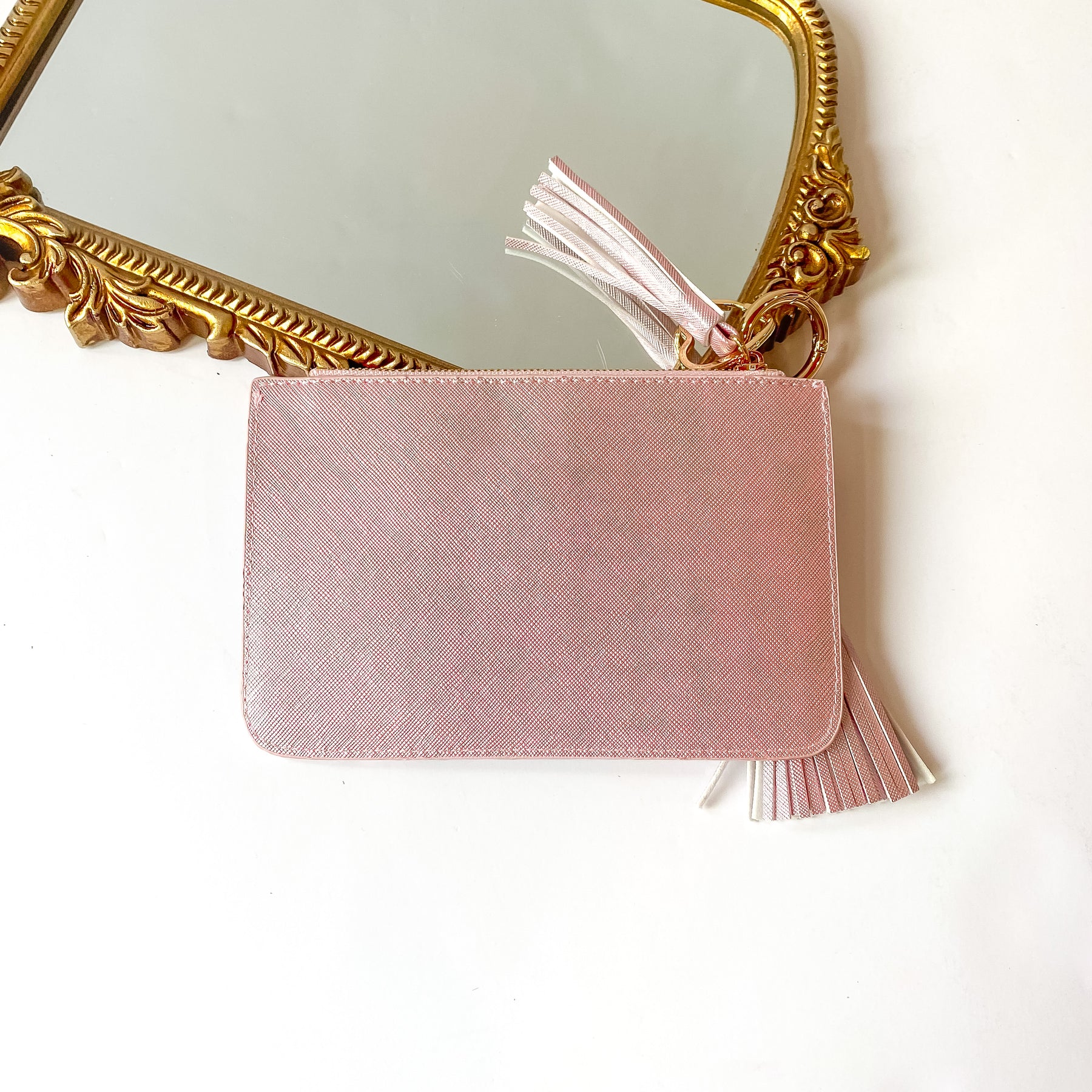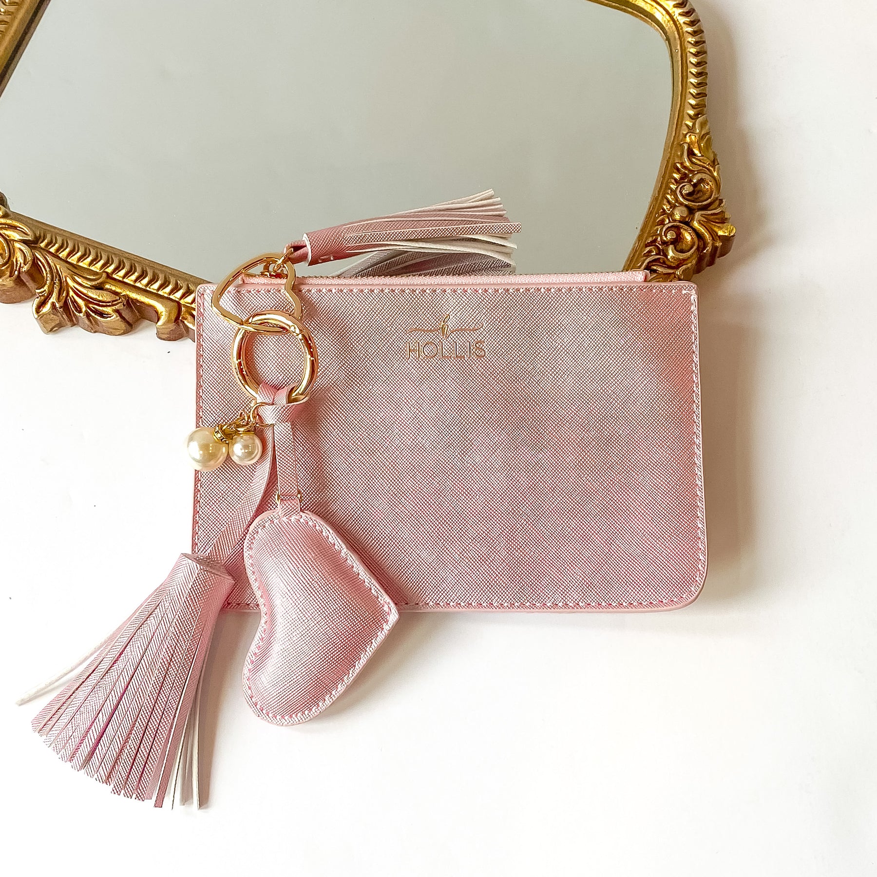 Metallic blush pink coin pouch with a gold HOLLIS emblem at the top and a top zipper. This coin pouch has a gold key ring, gold heart key ring, a blush tassel charm, a blush heart charm and white pearl charms. This luggage tag is pictured partially laying on a gold mirror on a white background.
