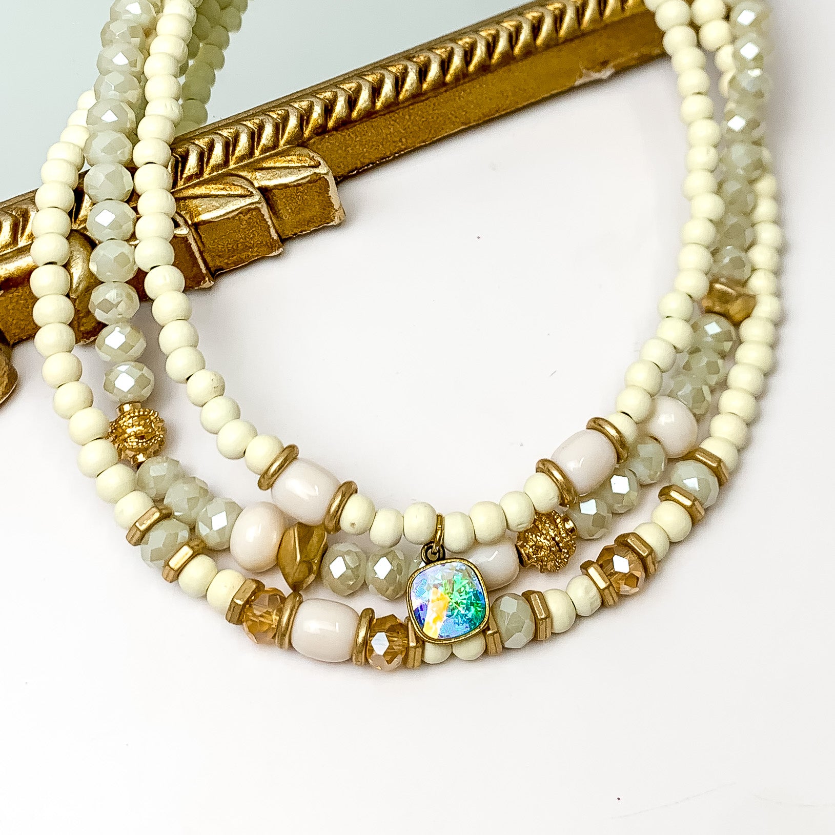 Pink Panache | Three Strand Ivory Crystal and Wood Beaded Necklace AB Cushion Cut Drop