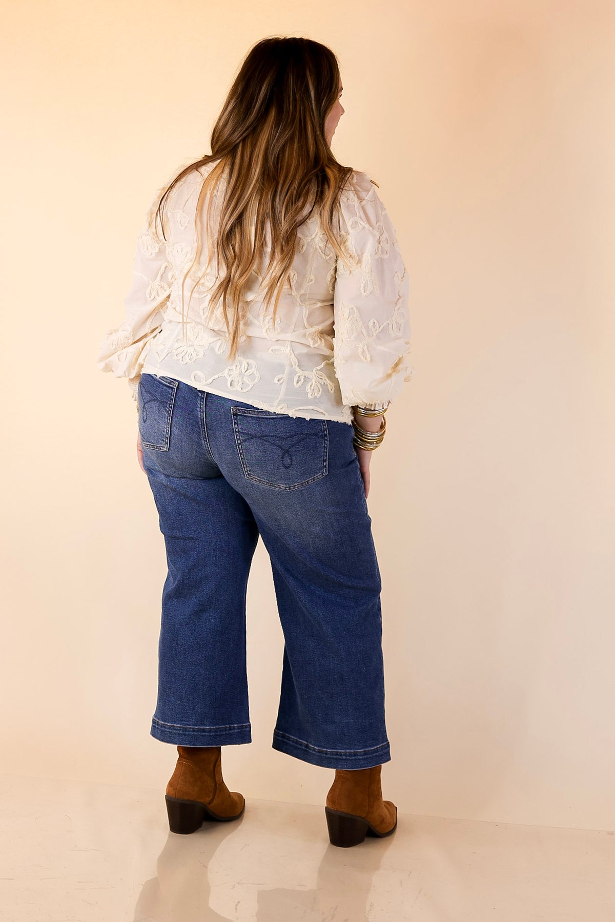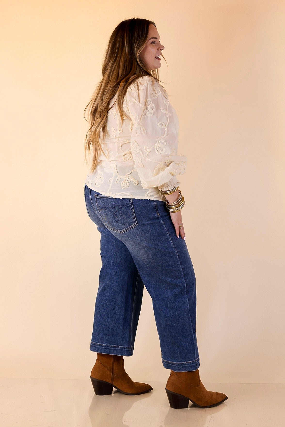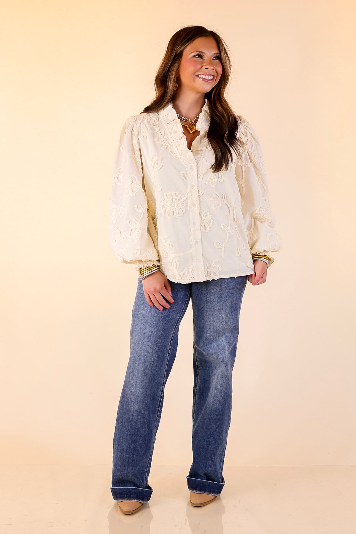 Soft, feminine, and endlessly versatile—our Timeless Romance top is all about elevated charm. Designed in a cream woven fabric with delicate tonal floral embroidery, this blouse features a button-front closure framed by ruffle trim and finished with balloon sleeves for a touch of drama. Whether you’re headed to work, brunch, or date night, this beauty adds just the right dose of polish to your look.