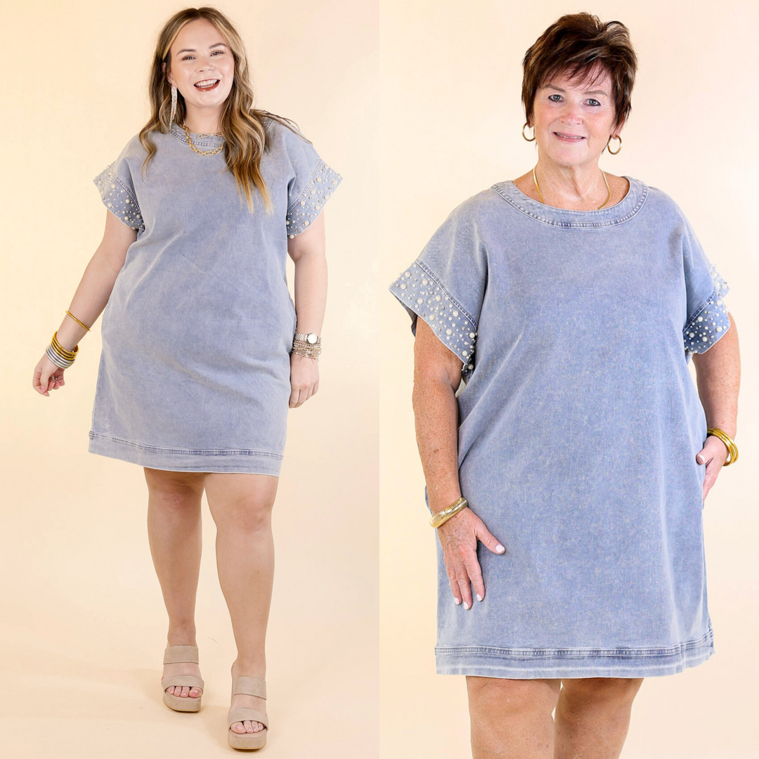 Dance All Night Denim Dress with Pearls and Crystals in Light Wash