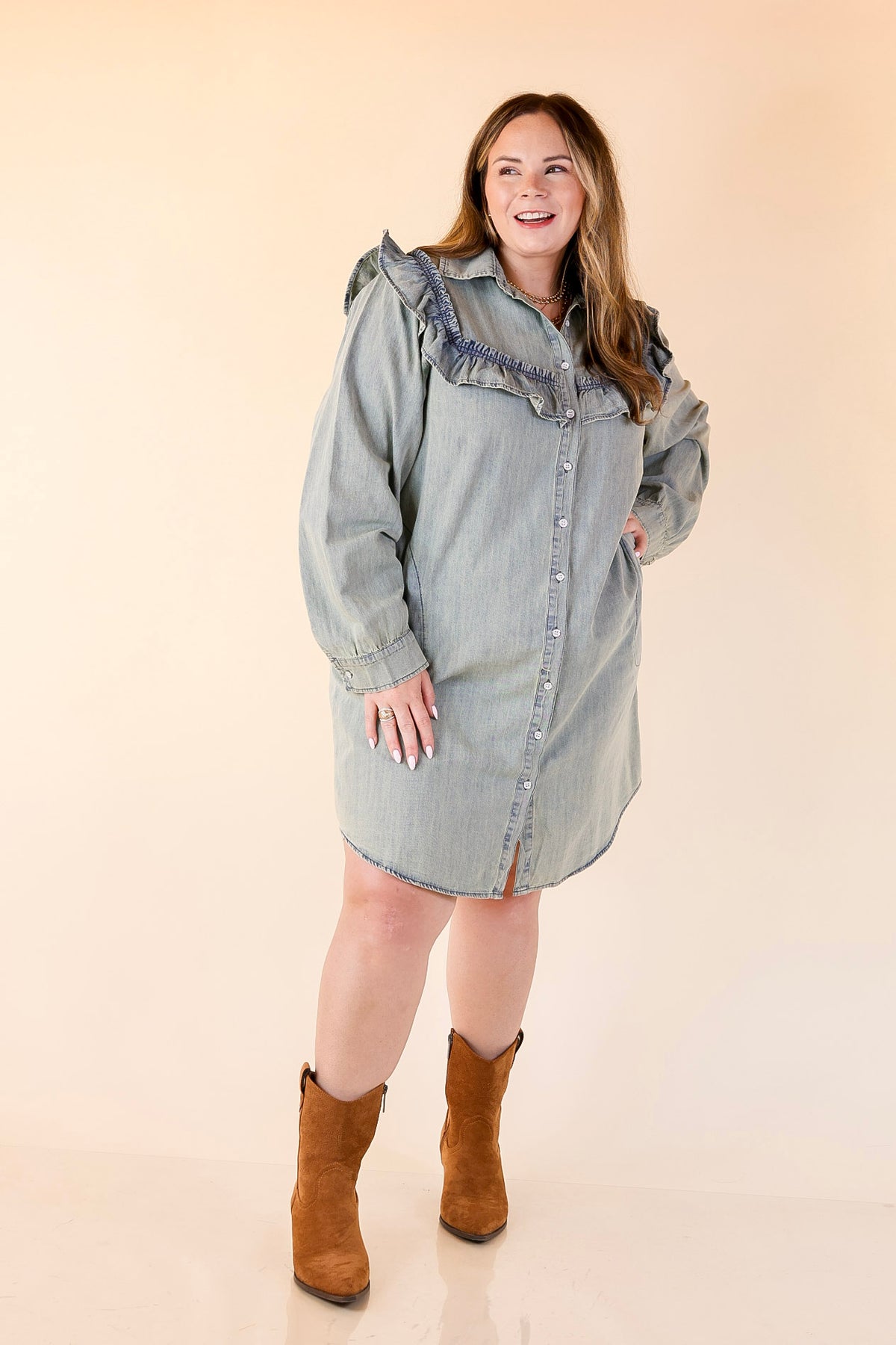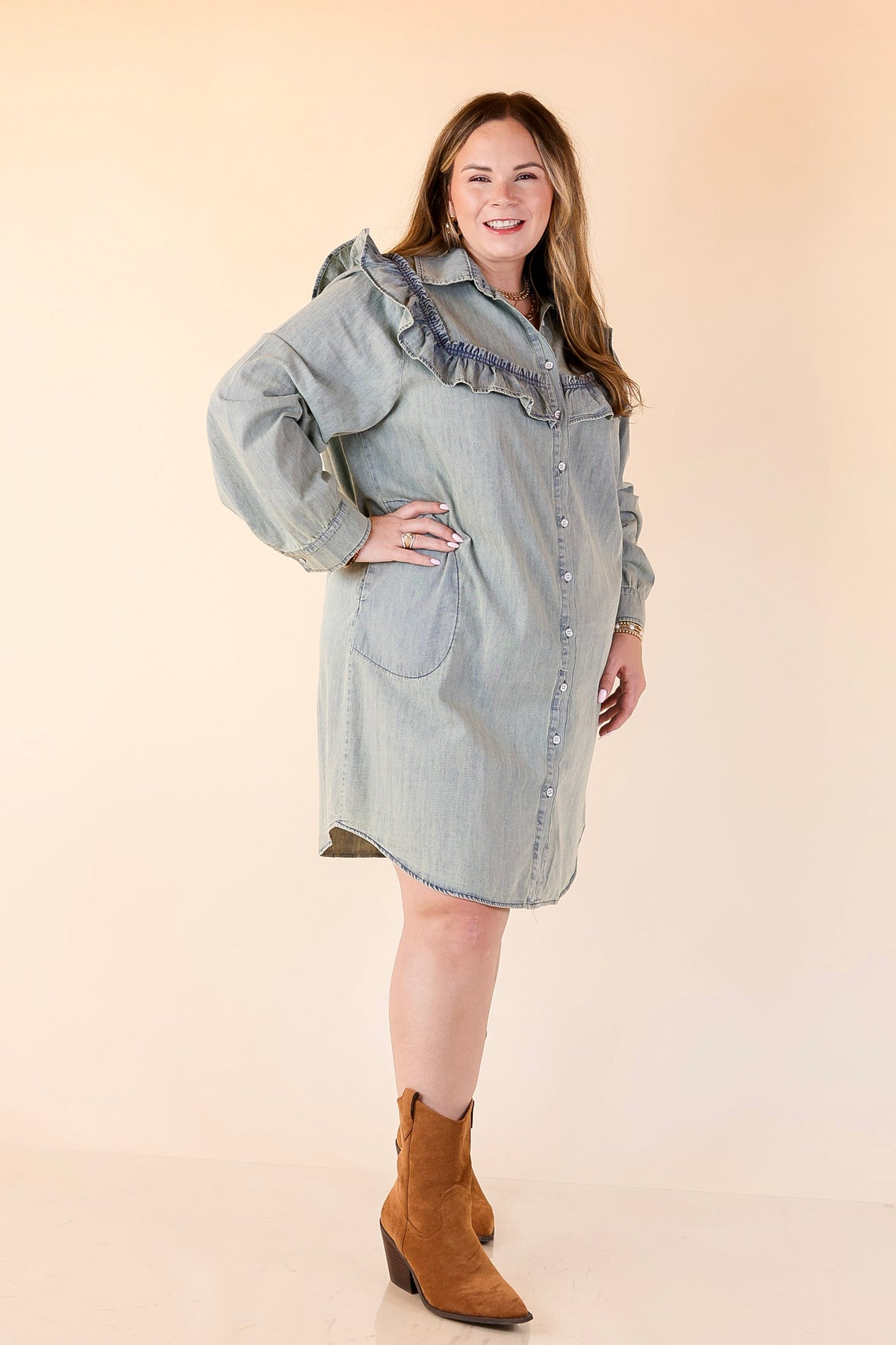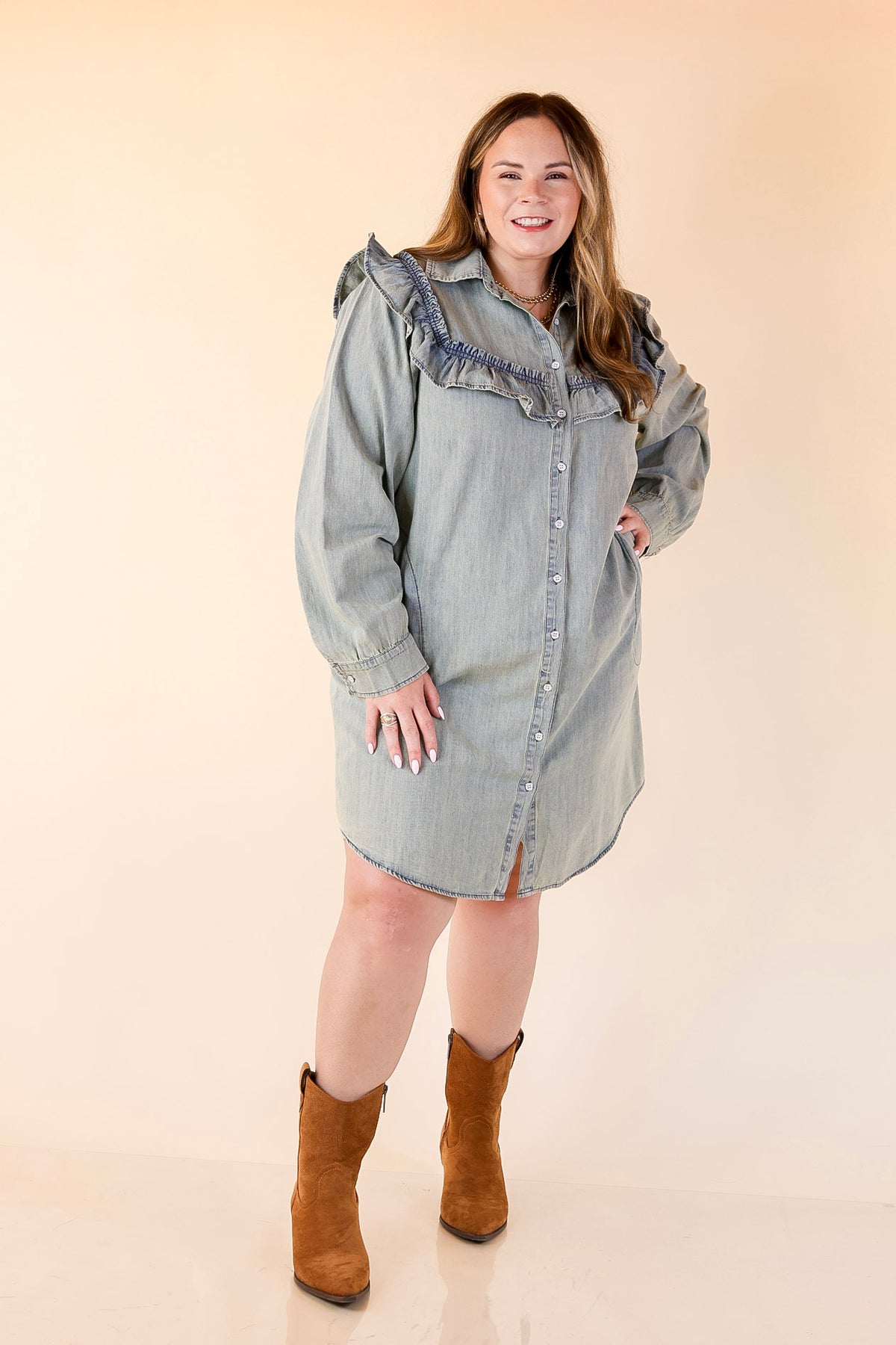 Meet your new go-to denim dress: the Blue Jean Beauty Ruffle Trim Shirt Dress. Effortlessly cool with just the right amount of feminine flair, this dress blends everyday ease with chic detail. The light wash denim keeps it casual, while the playful ruffle trim across the shoulders adds a touch of charm that sets it apart.