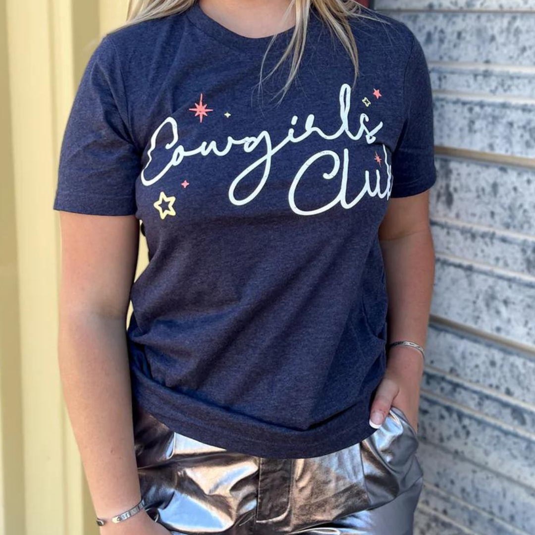 Welcome to the COWGIRLS CLUB!  Fun and comfortable, this tee is true to size and perfect for any cowgirl. Show off your love for the western lifestyle in style. Join the club today!