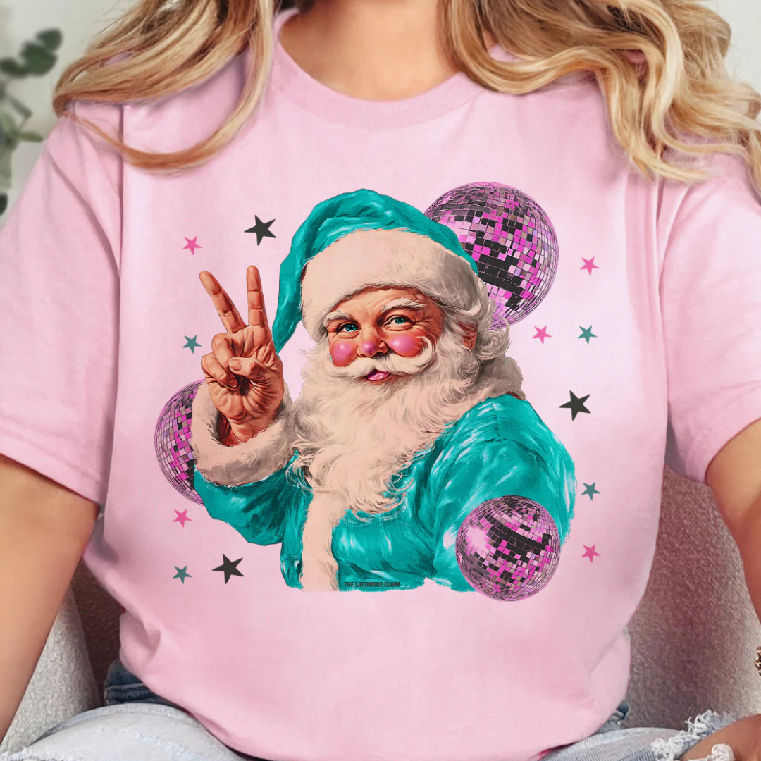 Unleash your inner disco diva this holiday season with our Disco Santa Peace Hand Graphic Tee! Featuring a pink color and a festive graphic of Santa surrounded by pink disco balls, this tee is perfect for spreading peace and holiday cheer. Get yours now before it's gone!