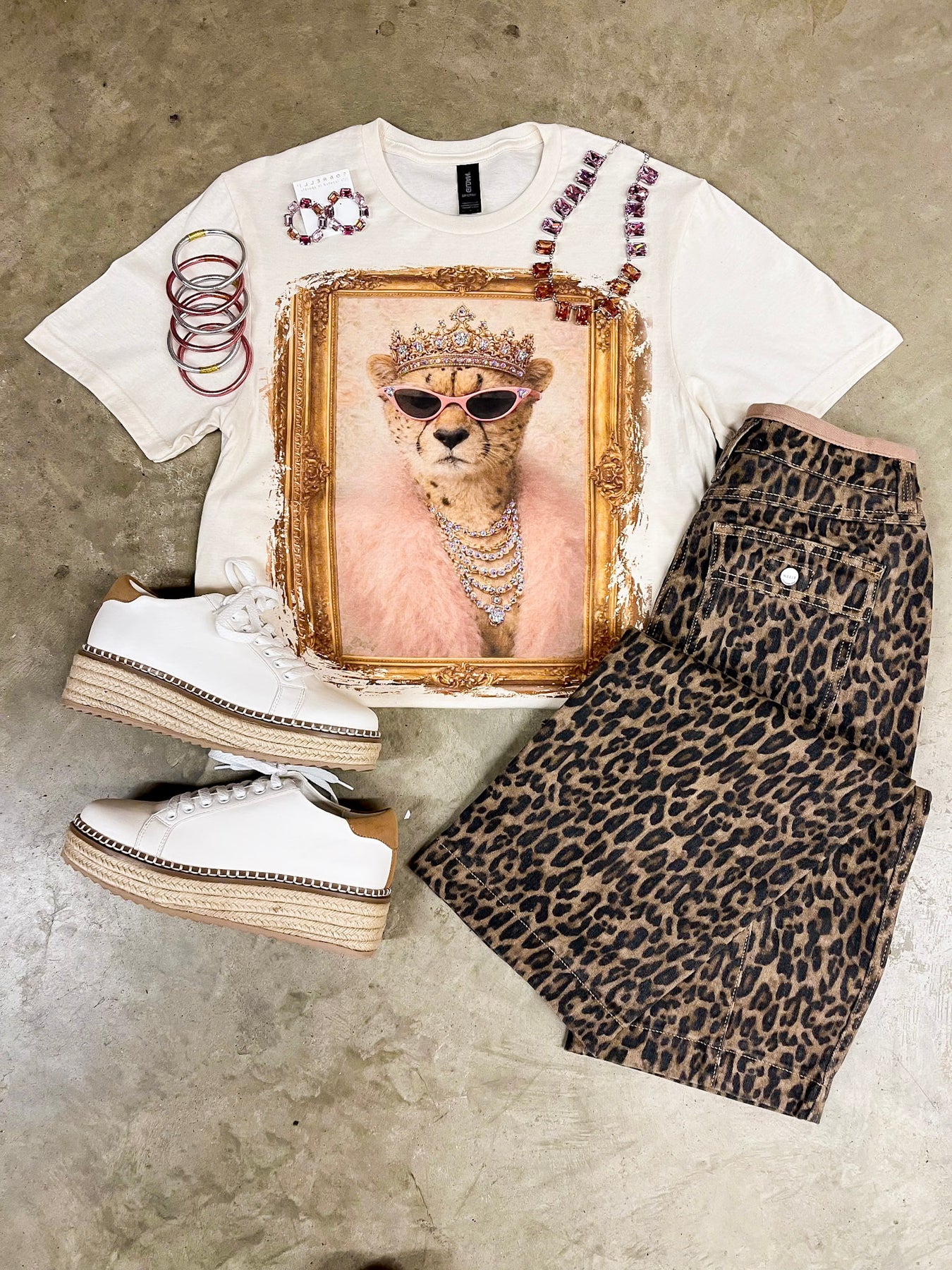 Meet Queen Cat, the fiercest glam queen in the lineup 👑🐆🩷✨ This cream short sleeve graphic tee features a chic cheetah portrait styled in a jeweled crown, pink cat-eye sunglasses, luxe layered crystal necklace, and a dreamy blush faux fur wrap—all framed in an ornate vintage gold portrait for the ultimate boutique statement piece.