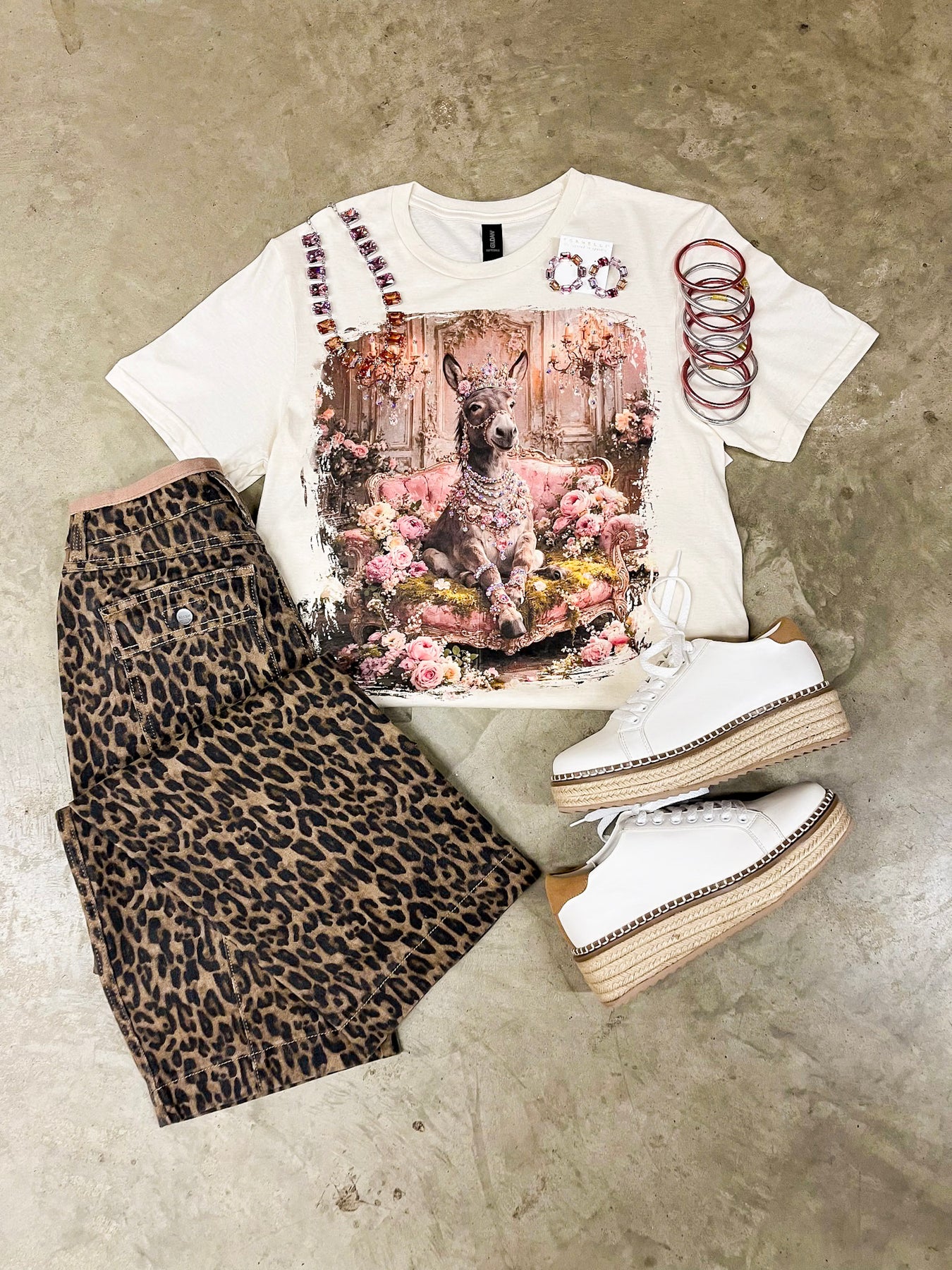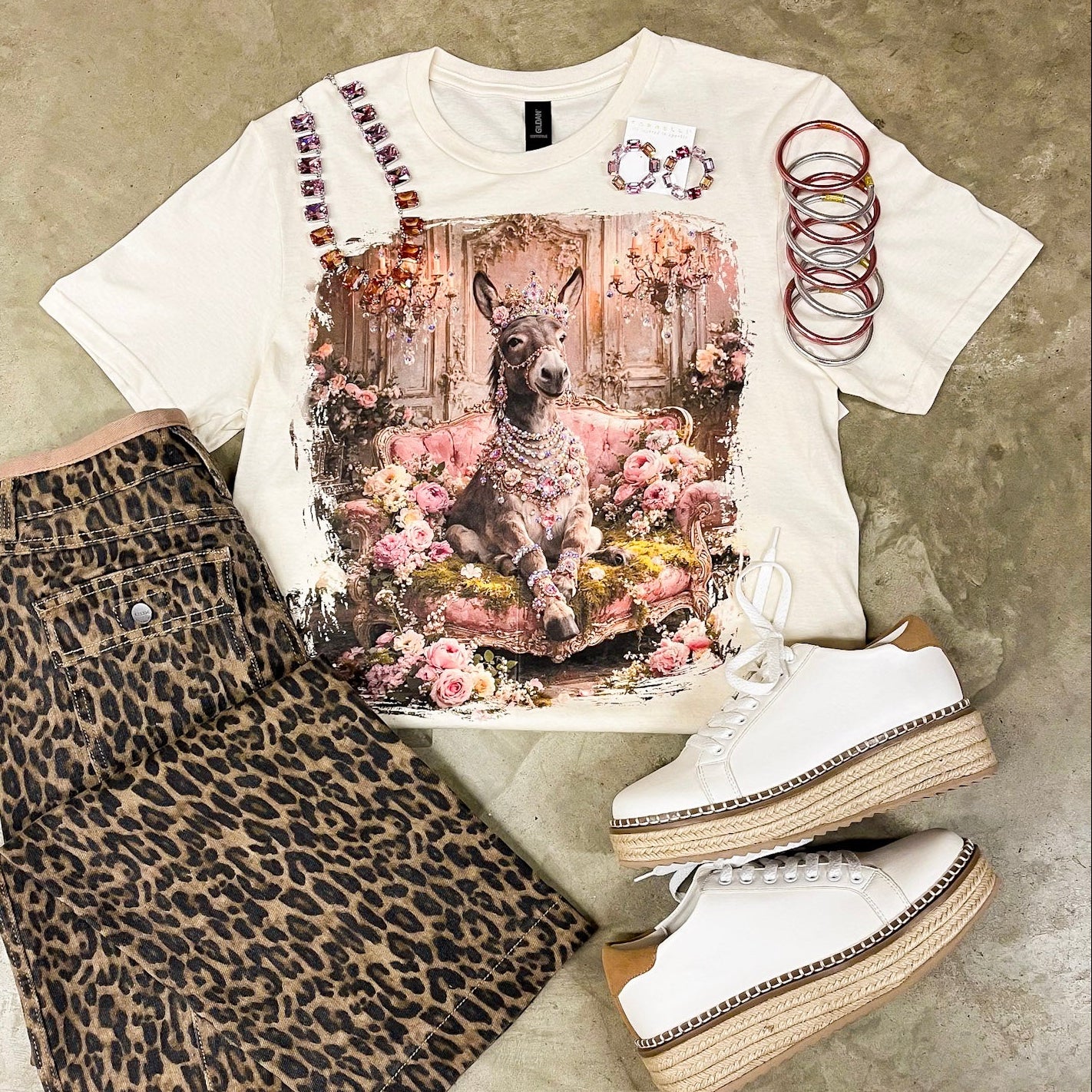 Bring on the royal treatment with Queen Sassy, the most glamorous donkey in the boutique 💖👑✨ This cream short sleeve graphic tee features a stunning jeweled donkey seated in an ornate floral manor scene, complete with sparkling chandeliers, layered statement jewels, soft pink florals, and the most regal crown moment. She’s elegant, playful, and dripping in personality—exactly the kind of standout graphic your customers will instantly fall in love with.