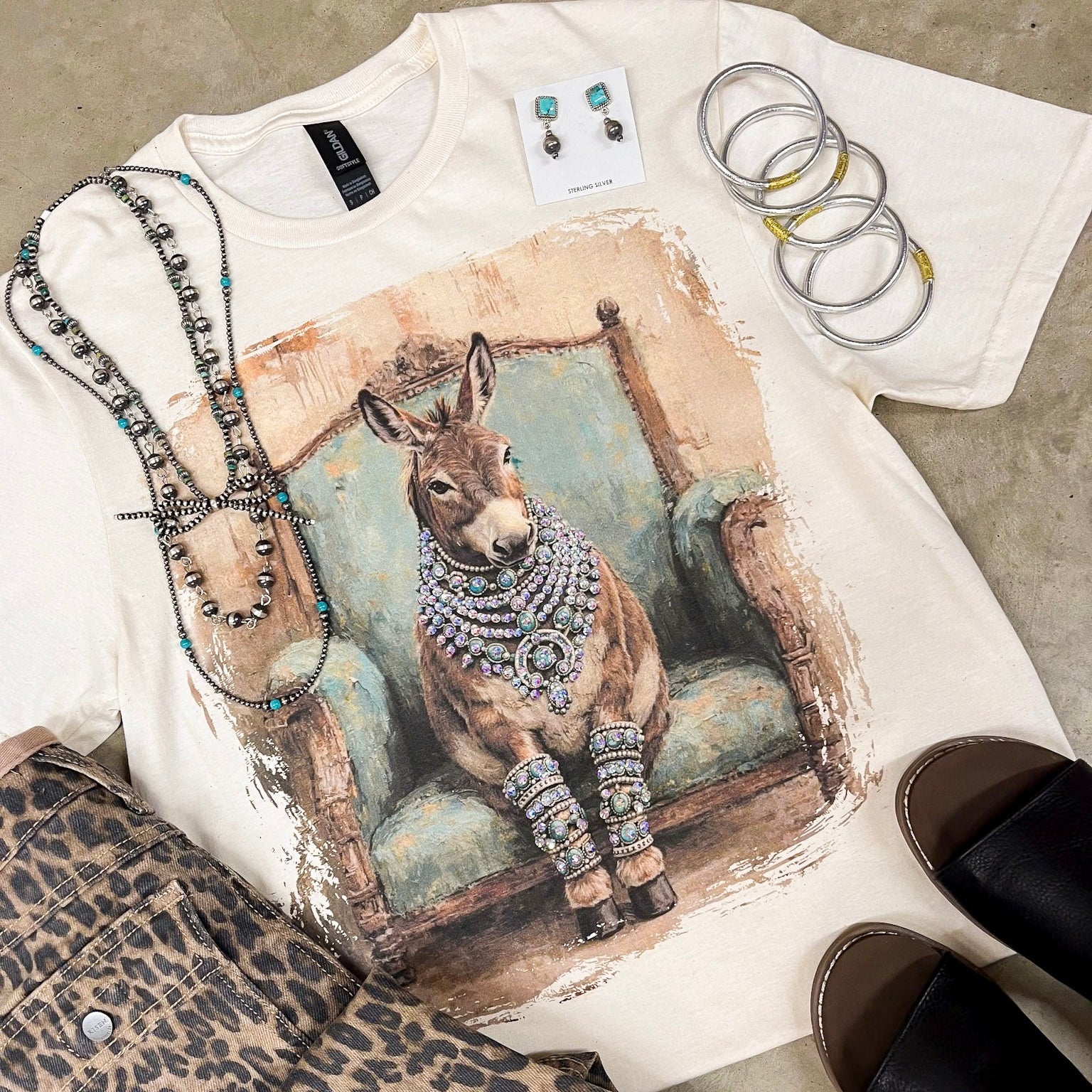 Turquoise Tilly Glam Turquoise Blue Donkey Short Sleeve Graphic Tee with Crystals in Cream