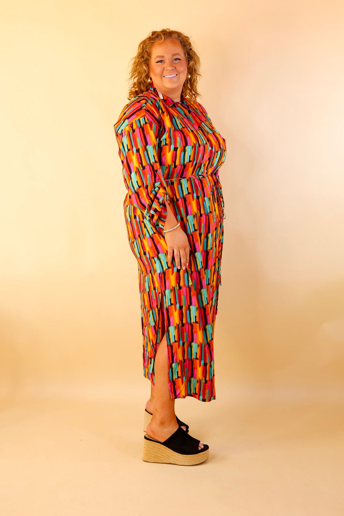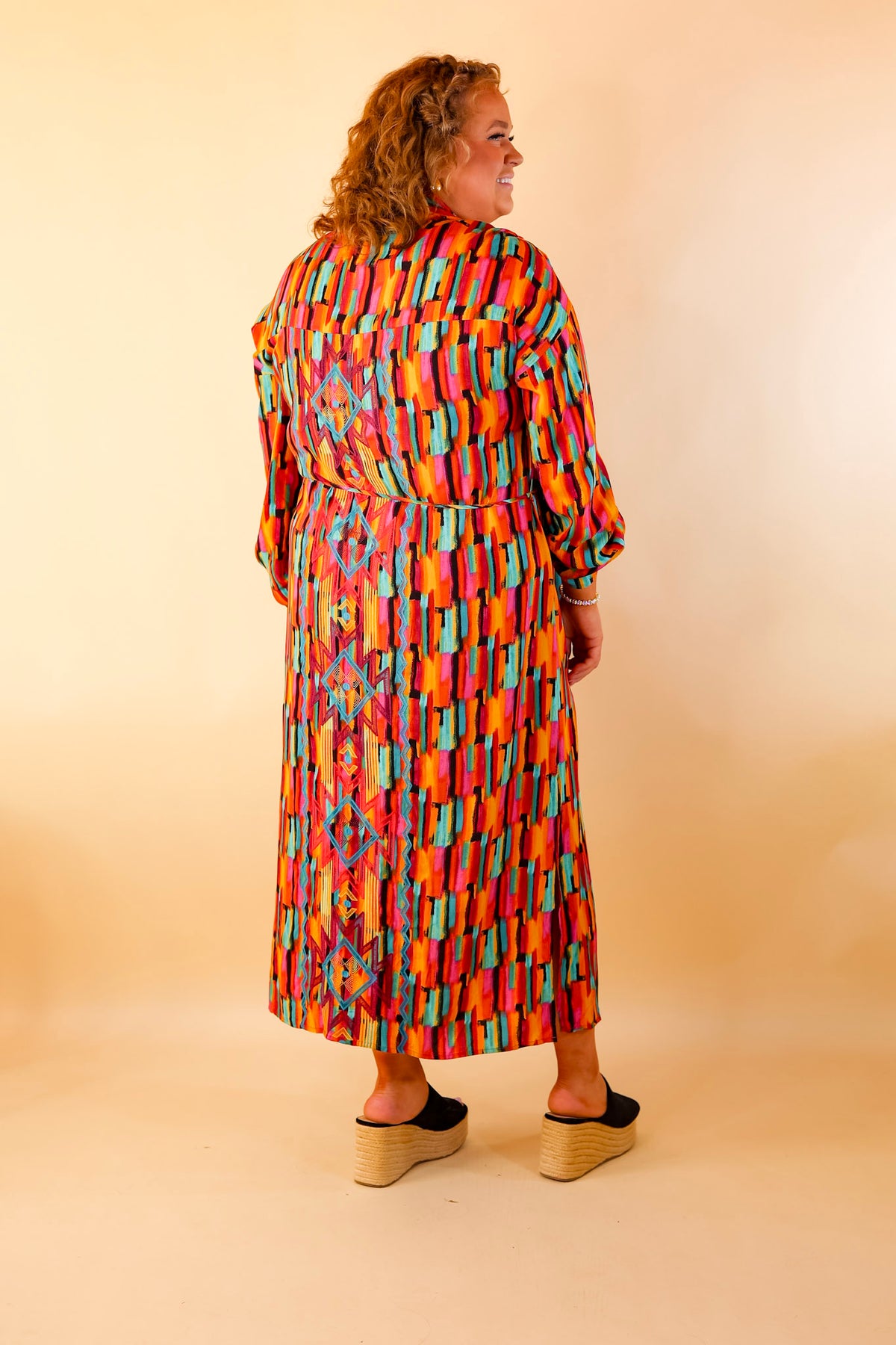 This dress is so adorable you'll want to play it again! It includes a button up front, collared neckline, Aztec embroidered back, 3/4 sleeves, and a watercolor print that is a mix of yellow, pink, black, teal, and green. Wear it as a dress or wear it open over a top and jeans!