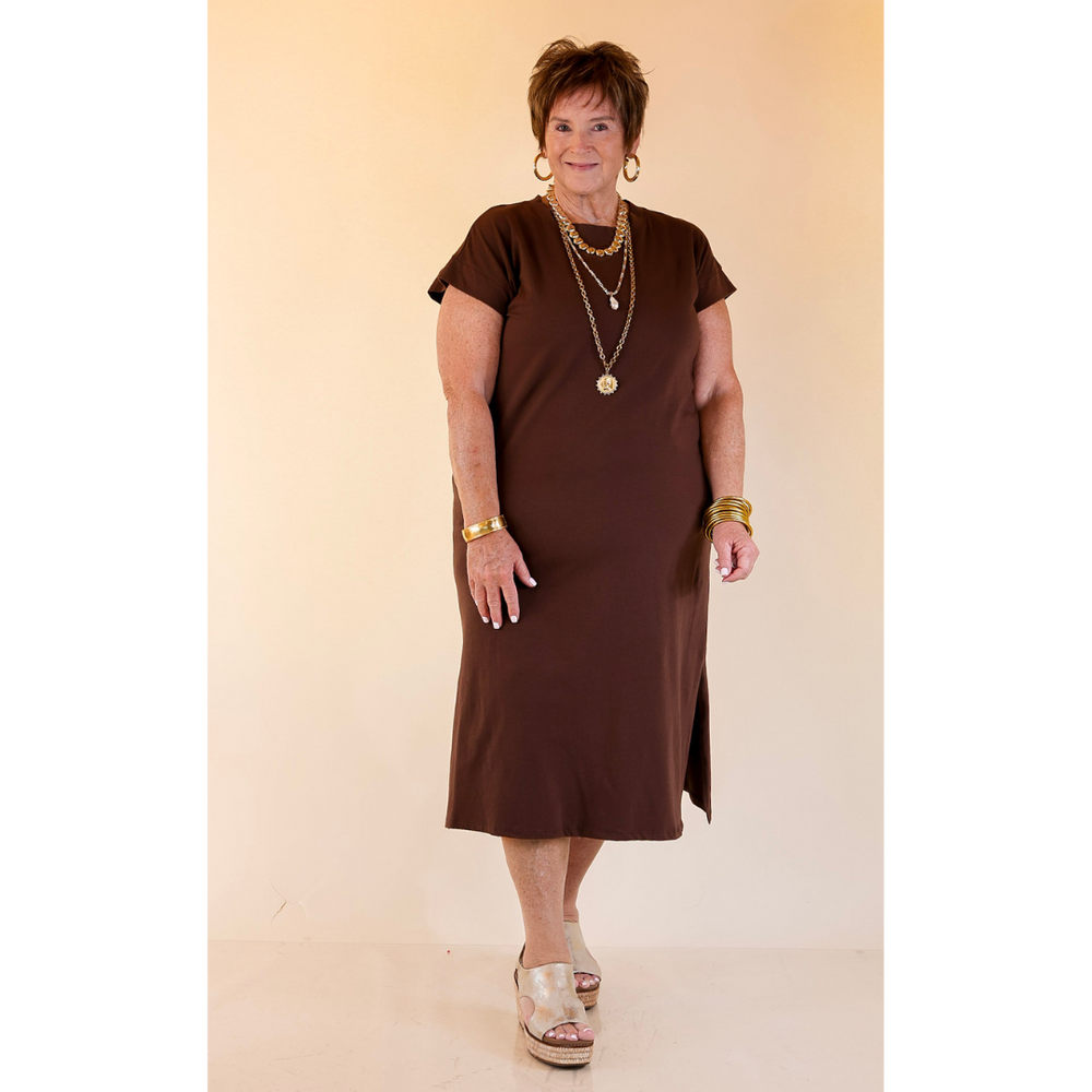 Effortlessly Lovely Short Sleeve Midi Tee Shirt Dress in Chocolate Brown