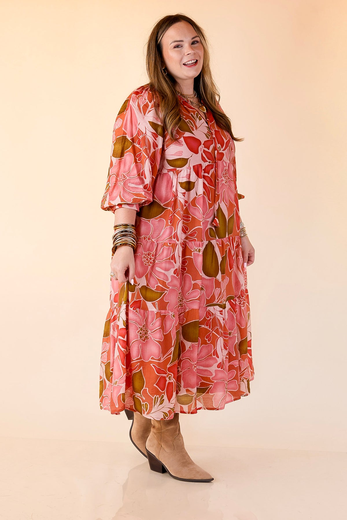 Step into effortless charm with our Budding Beauty Tiered Midi Dress—a flowy favorite that brings fresh florals to fall. Featuring a pink and olive floral print with pops of warm tones, this dress strikes the perfect balance of feminine and versatile. The tiered silhouette drapes beautifully, while the 3/4 balloon sleeves add a soft, stylish touch. Lightweight and easy to wear, it’s the kind of piece that moves from brunch to family photos to casual days out with total ease. Pair with boots for a fall-ready look or dress it up with heels and gold jewelry for a night out.