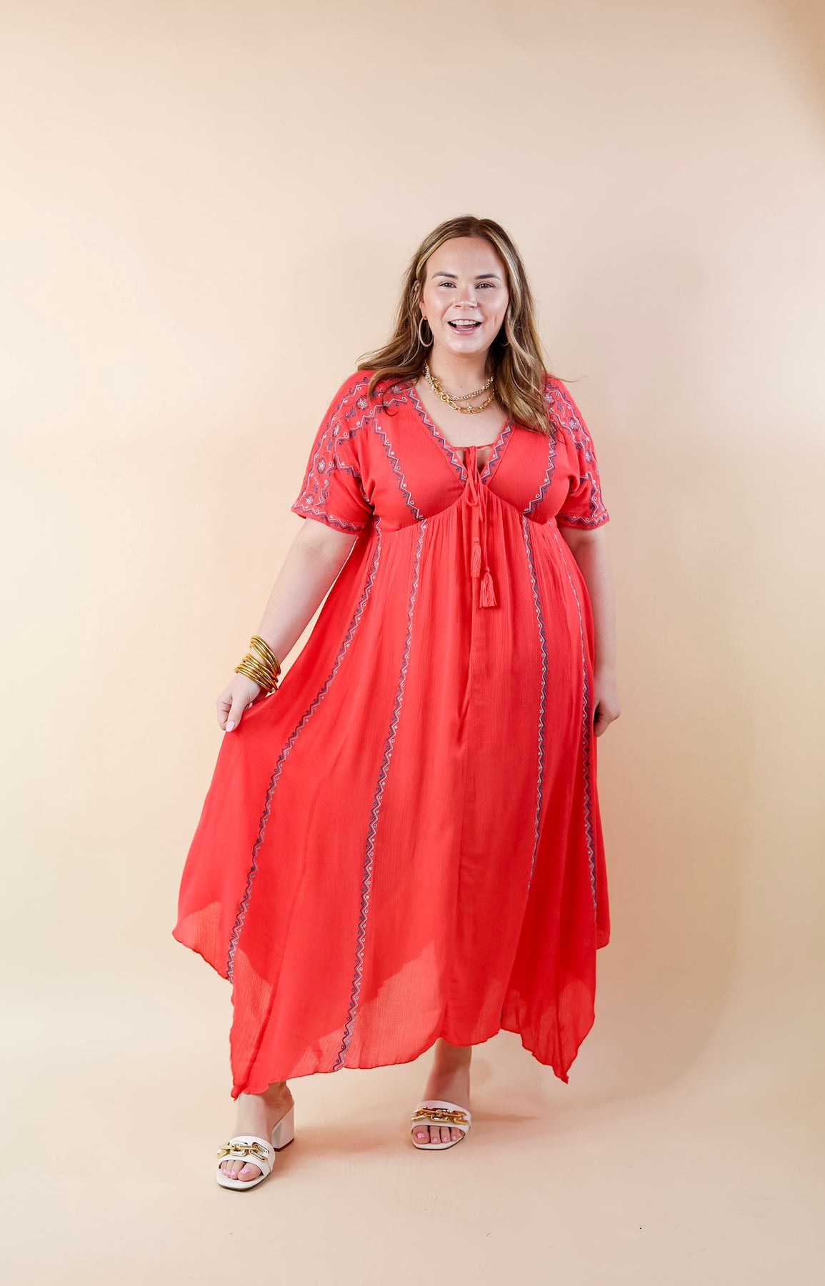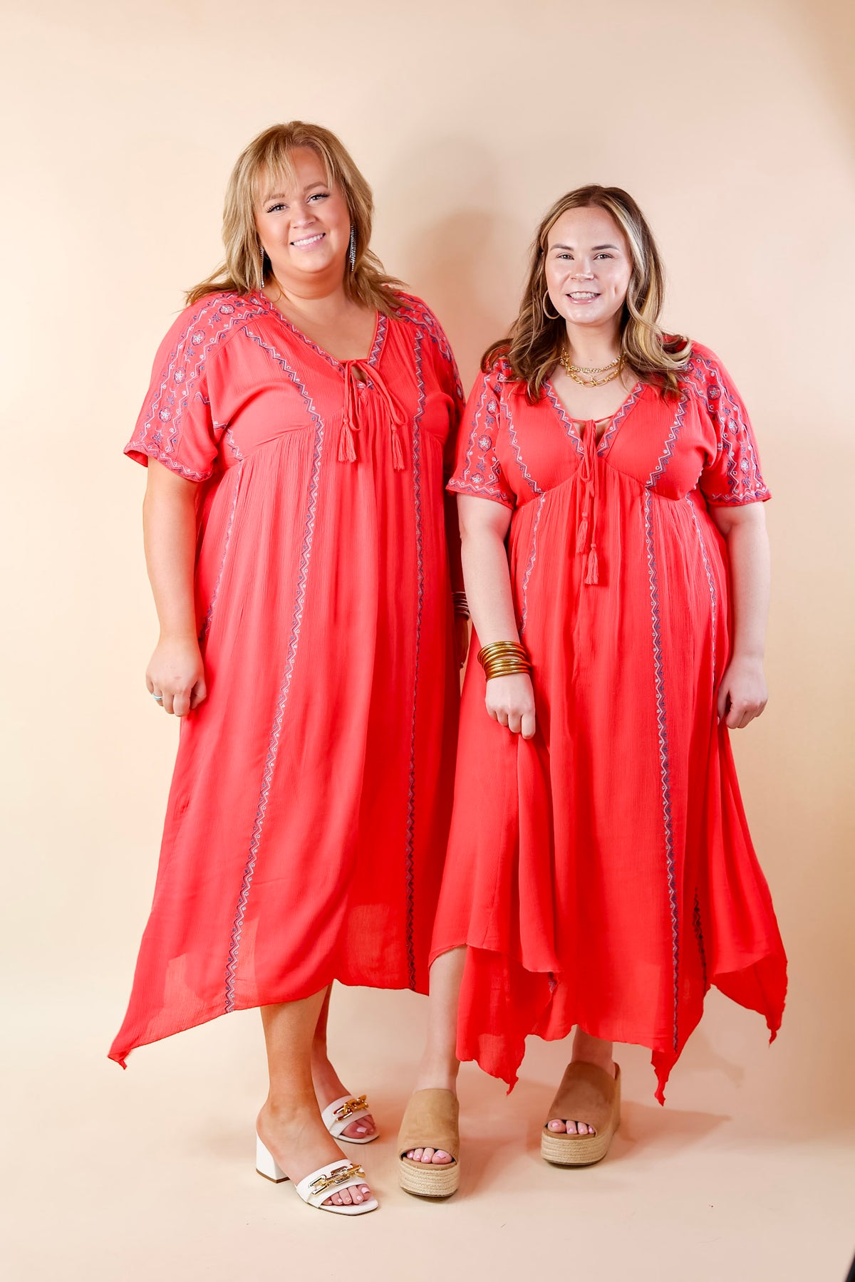 LAST CHANCE SIZE SMALL & MEDIUM | Just For You Embroidered Maxi Dress with Tassel Tie Neck in Coral