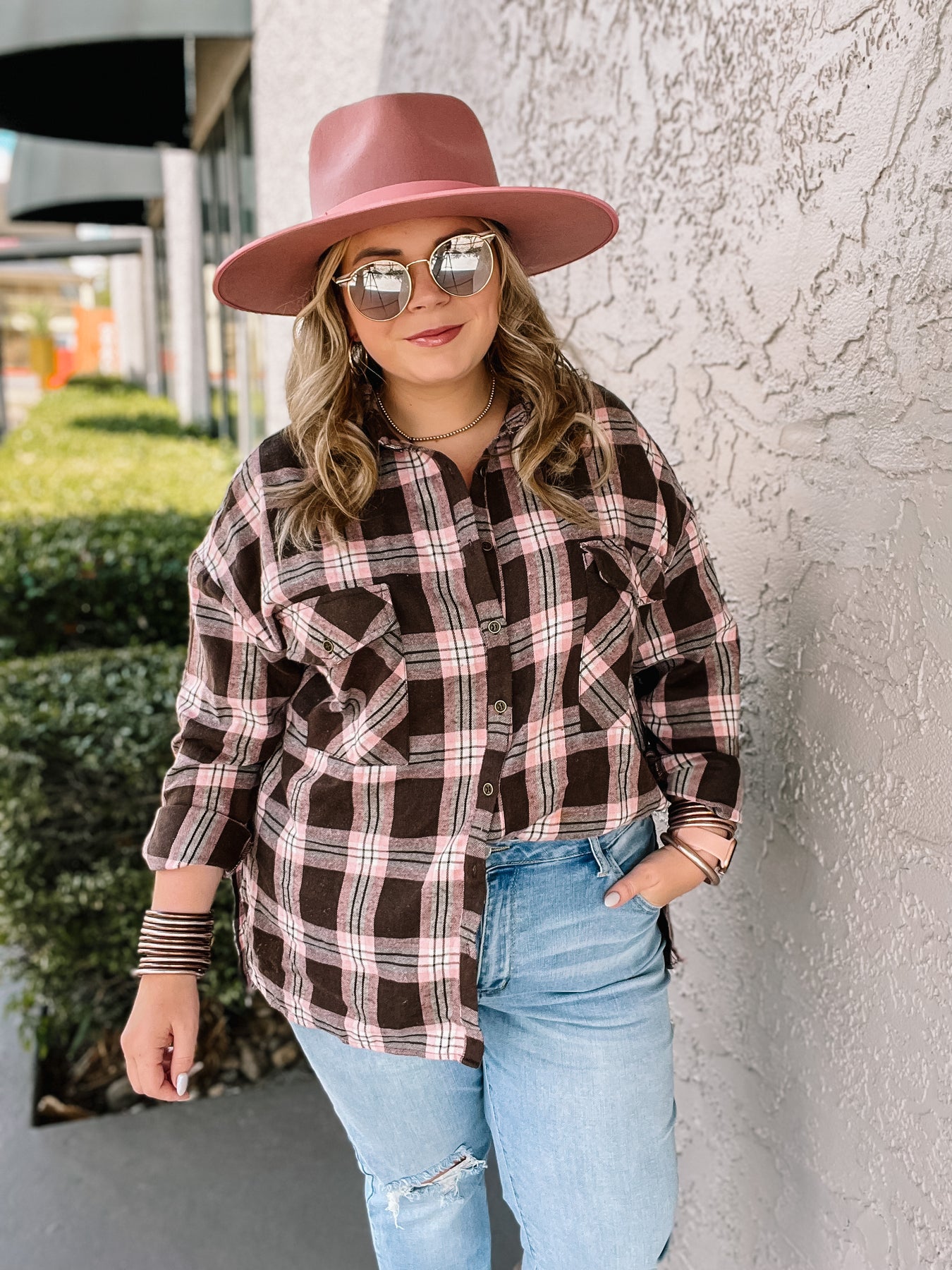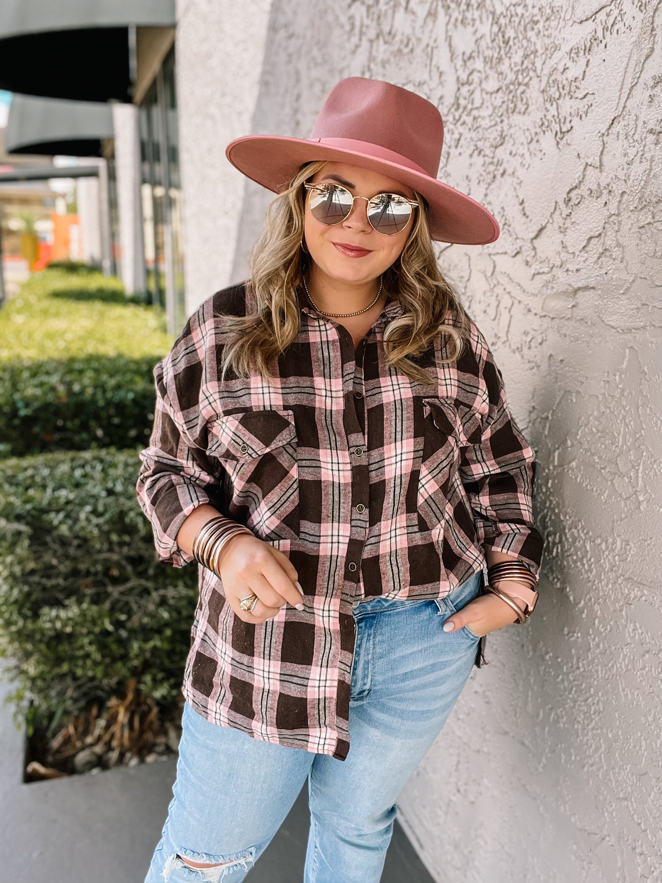 Cheery Mood Button Up Plaid Flannel Top in Pink and Brown