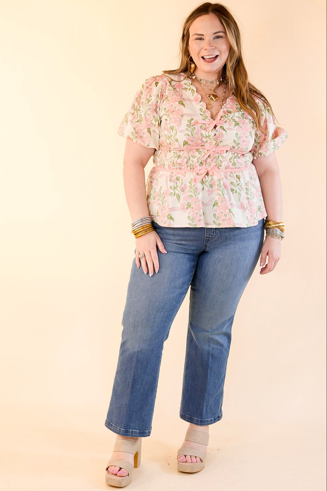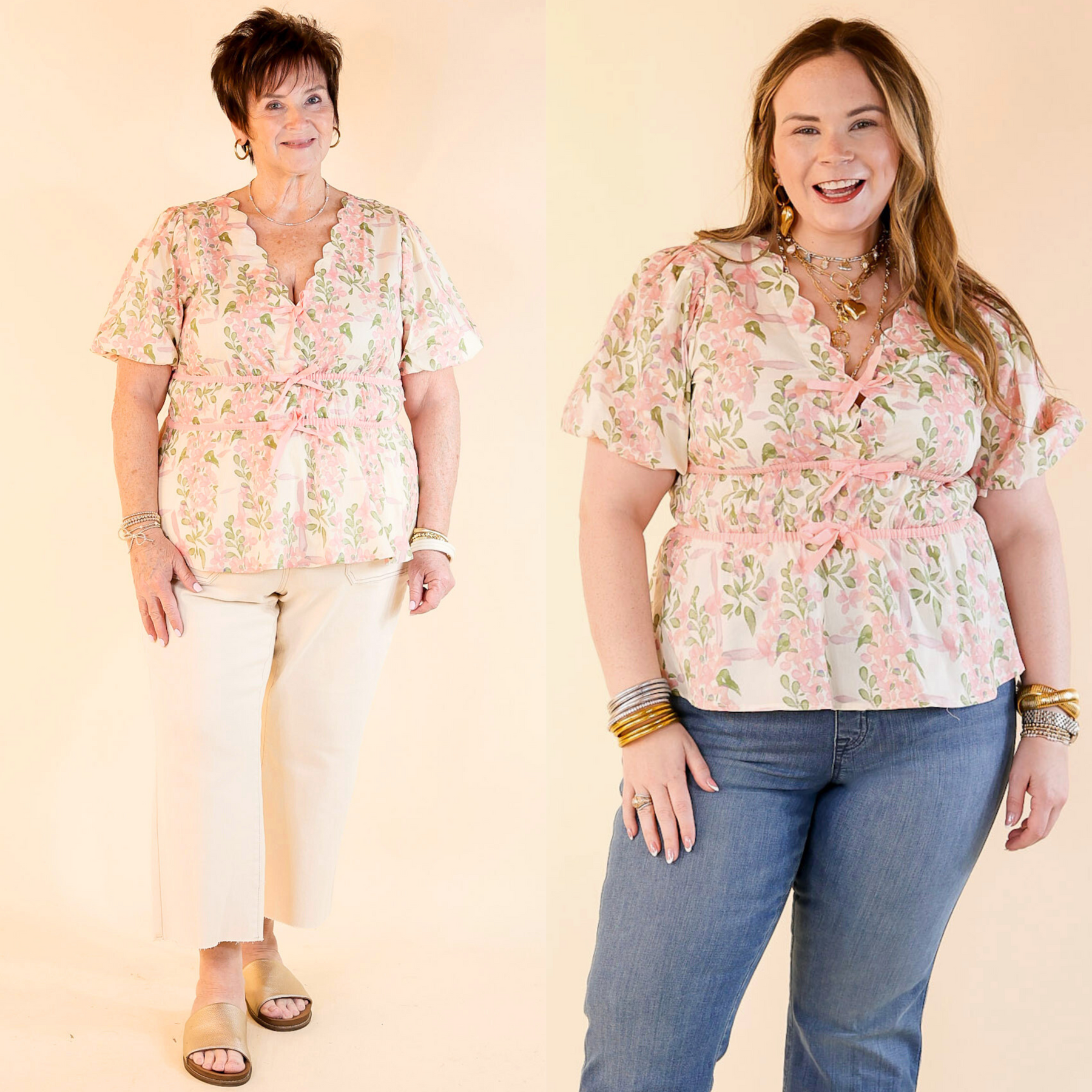 Chic Essentials Scalloped V Neck Floral Print Top with Puff Sleeves in Light Pink