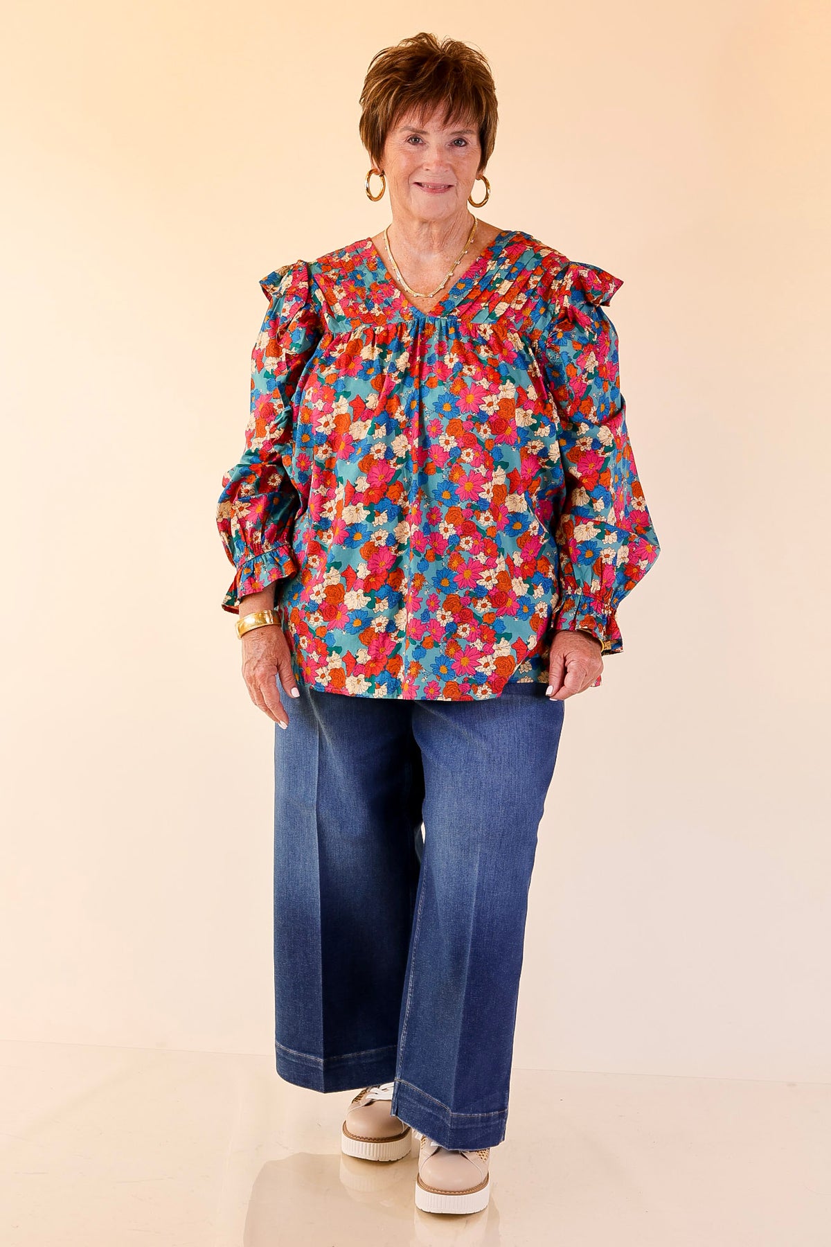 Coffee Perks Floral Ruffle Detail Long Sleeve Top in Turquoise Blue