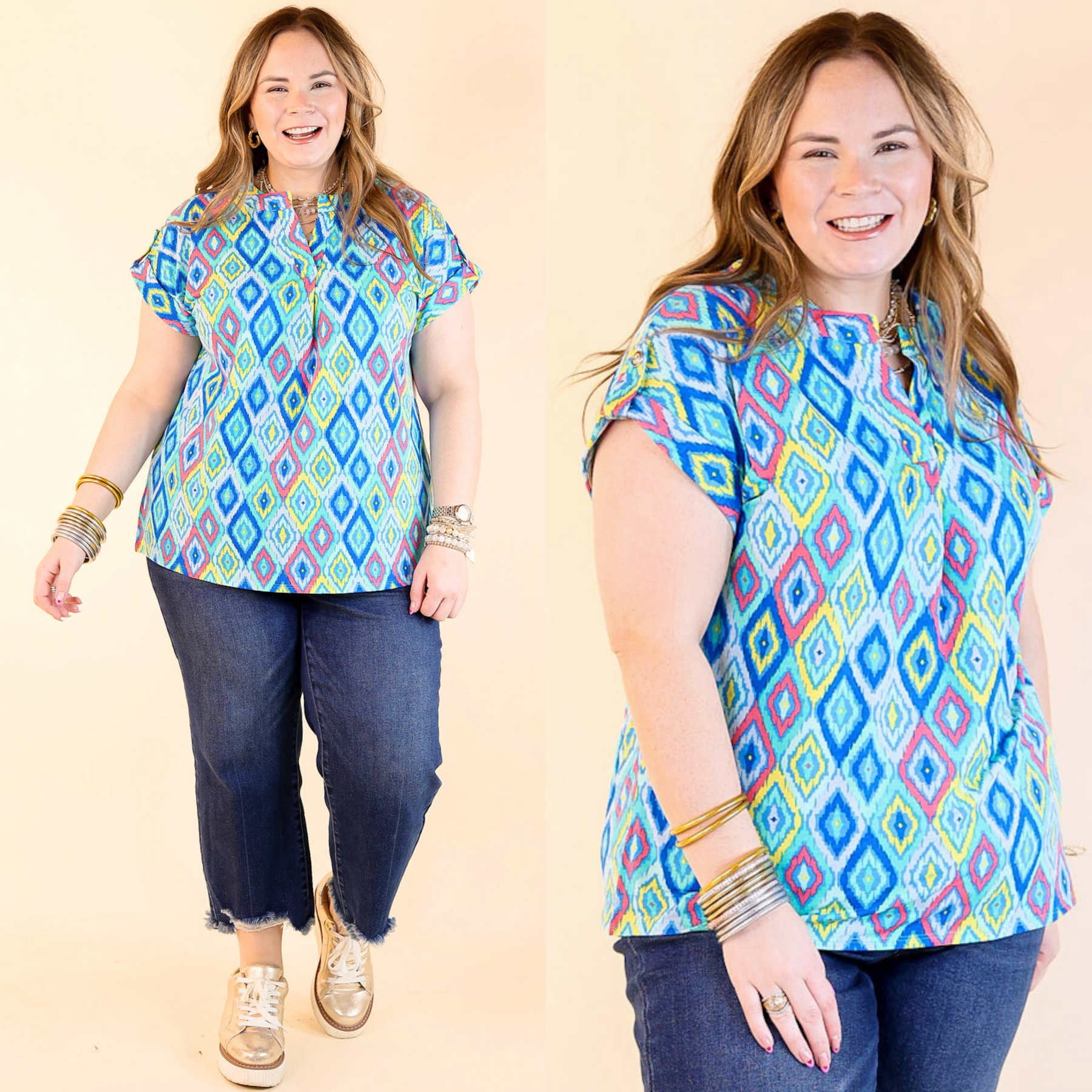 Downtown Darling Geometric Print Short Sleeve Tunic Top in Blue Mix