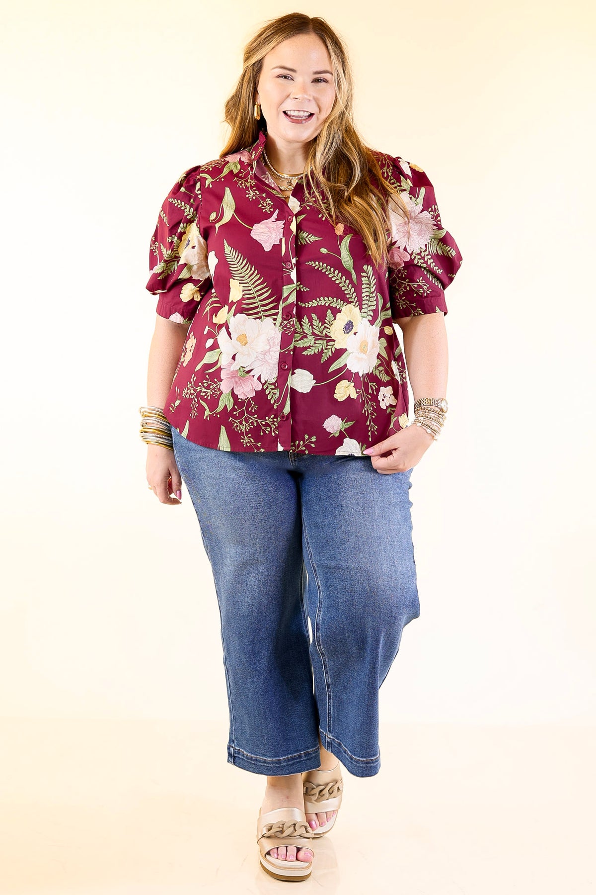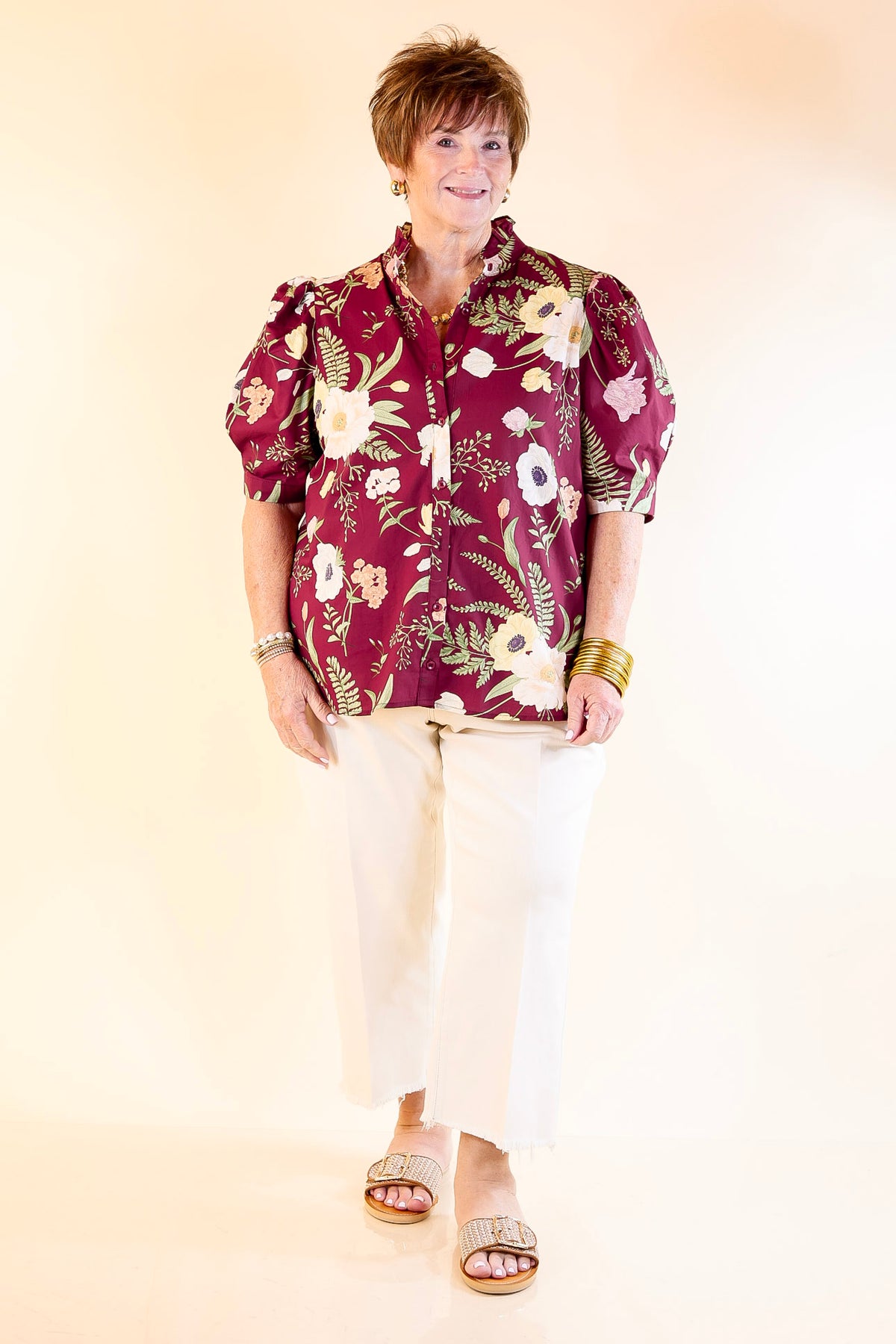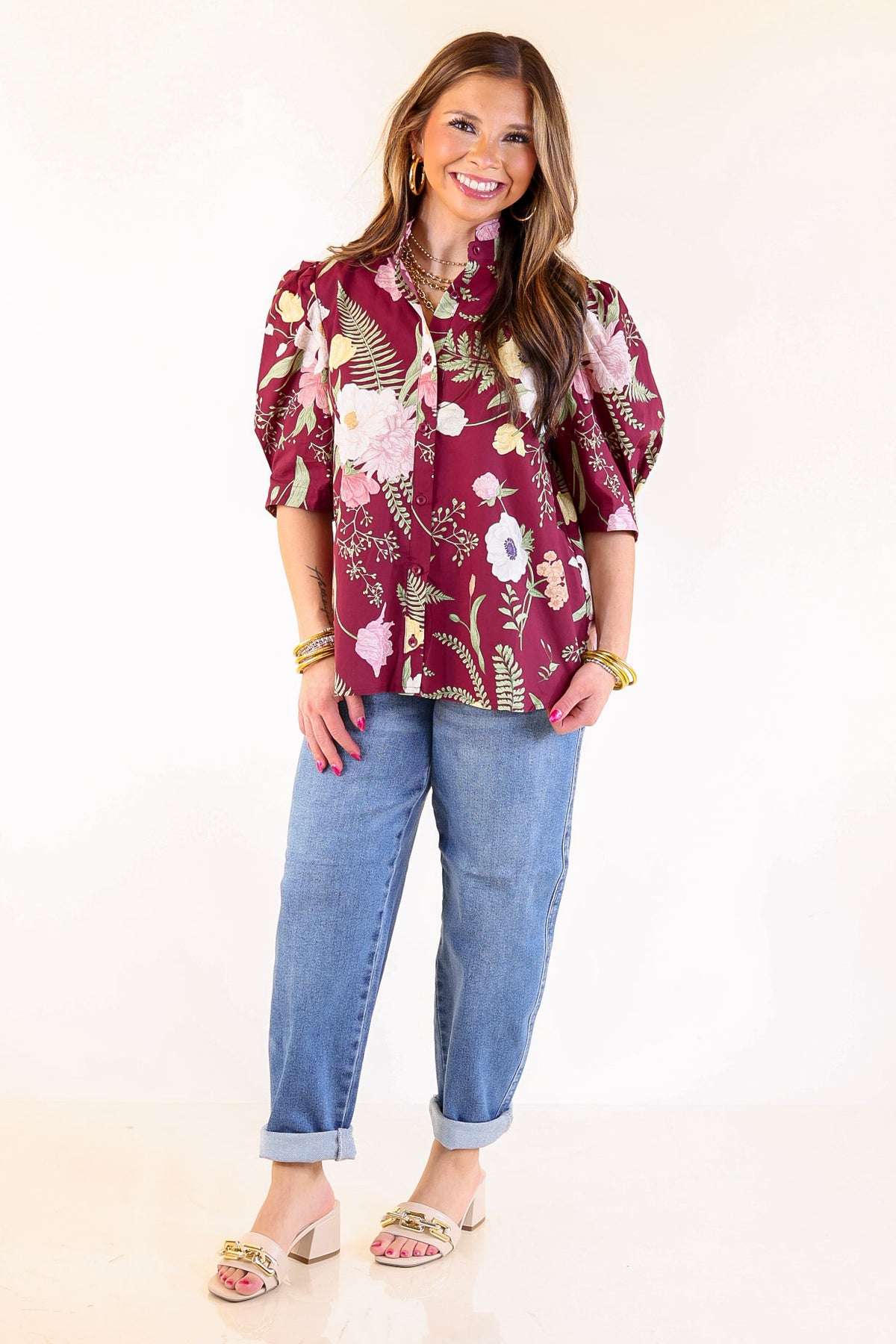 First Glance Button Up Puff Sleeve Floral Print Top in Maroon