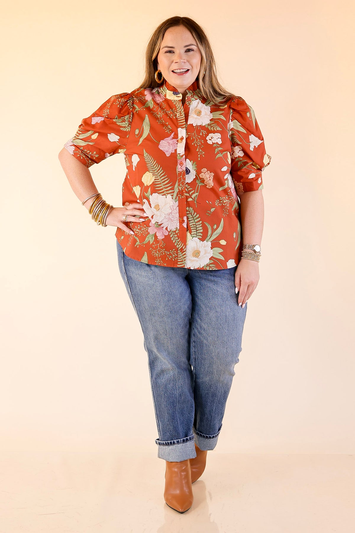 First Glance Button Up Puff Sleeve Floral Print Top in Rust Orange