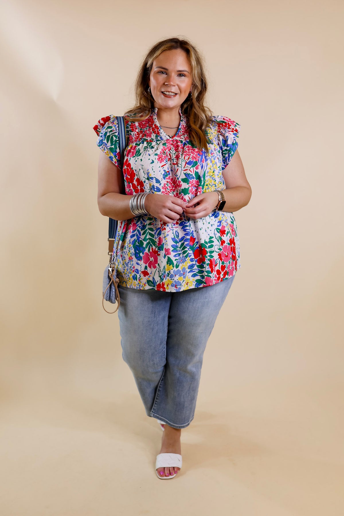 This top is apart of our lovely Spring line up! This piece will carry you through Spring and Summer with fun florals and colors! It includes ruffle cap sleeves, a high ruffle neckline that is notched at the front, smocked detail around the shoulders, and a bright abstract print that is a mix of blue, white, red, pink, green, and yellow. This top has a slight a-line body for a flowed look to the hemline while staying more fitted around the shoulders and bust. Pair this with Judy Blue shorts and sandals for a fun look!