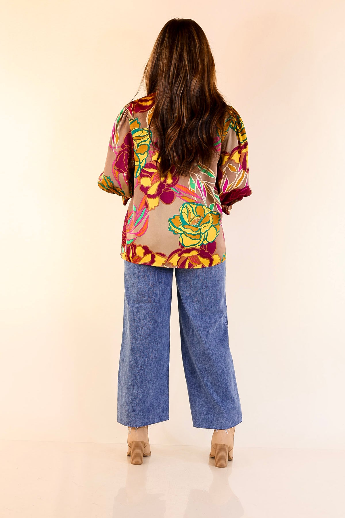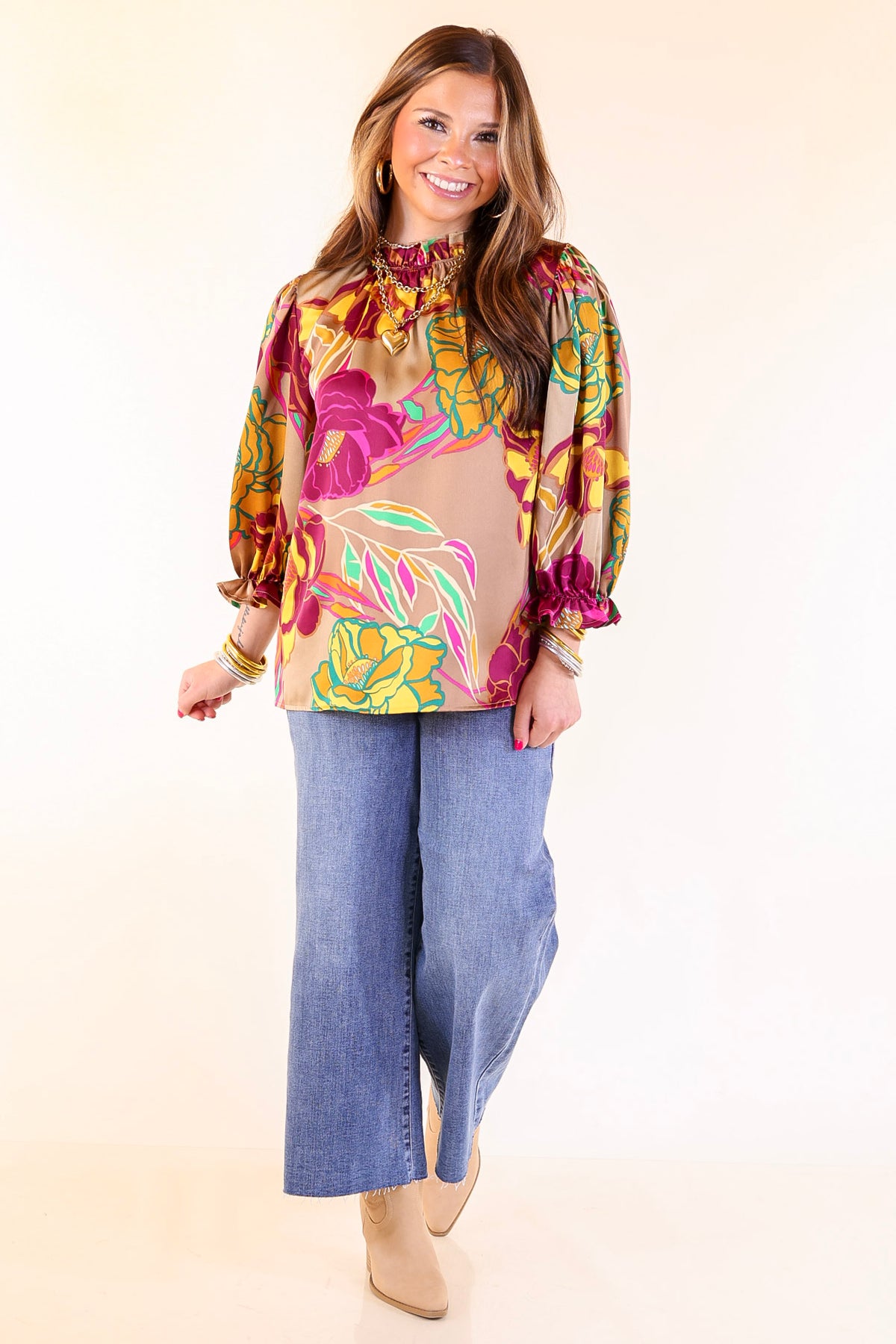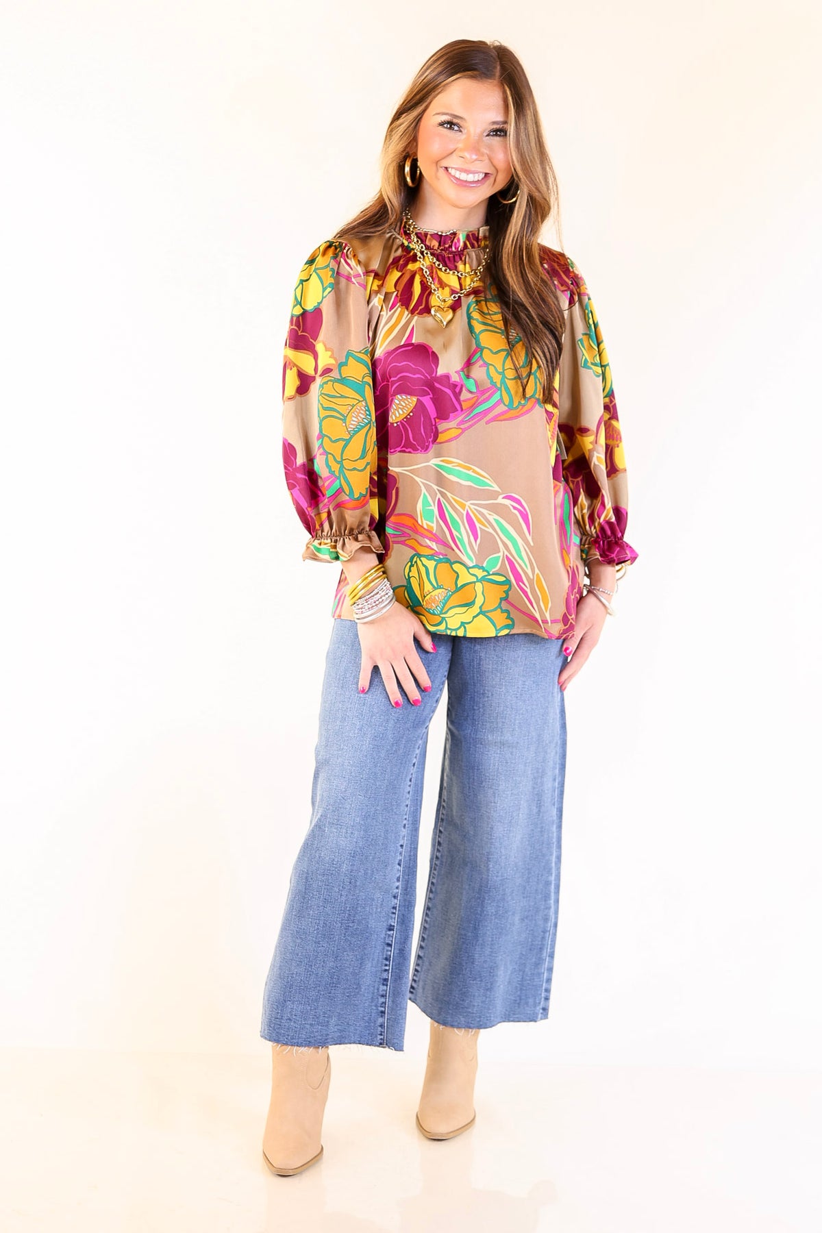 Follow Your Floral Long Sleeve Ruffle Mock Neck Top in Mocha