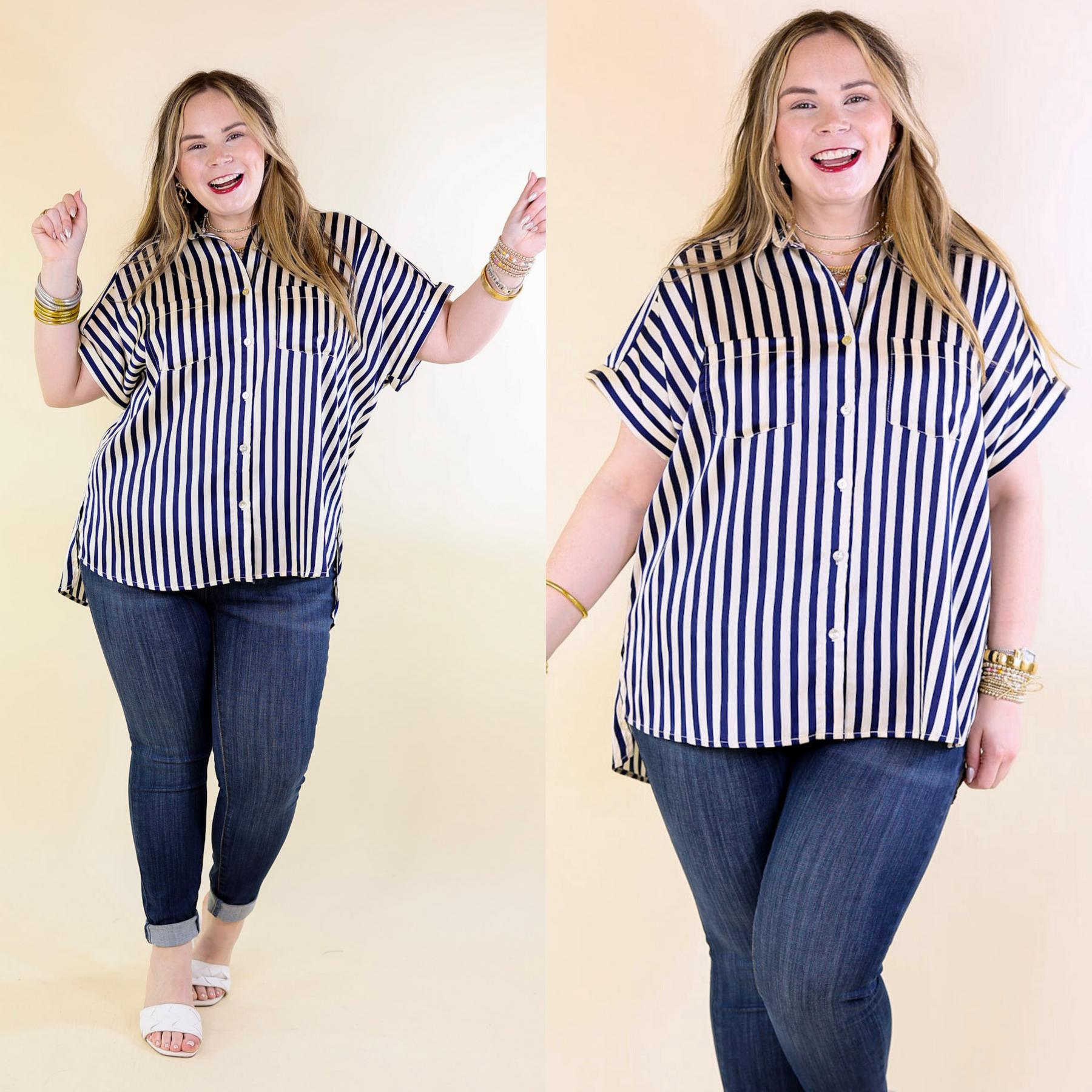 Free To Be Fab Button Up Short Sleeve Striped Top in Navy Blue