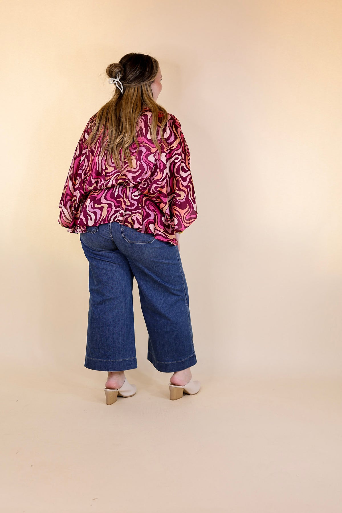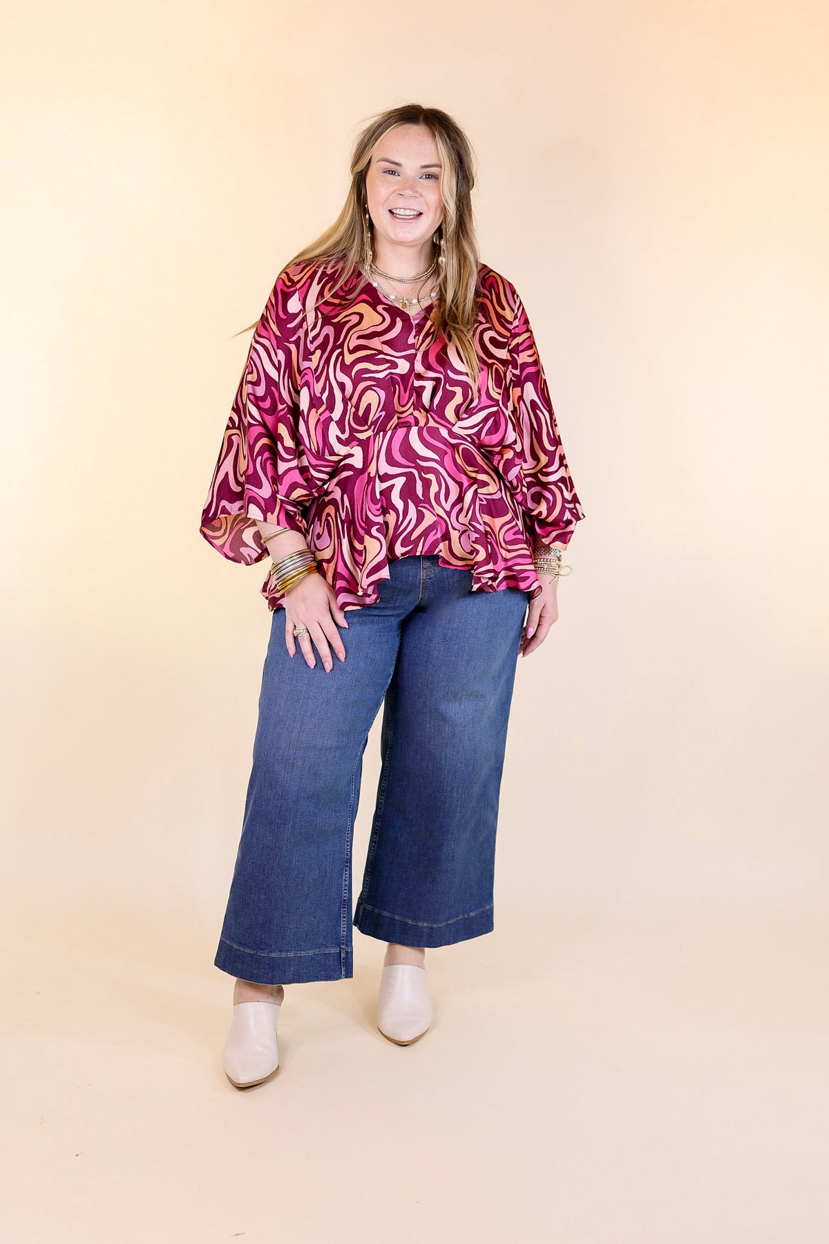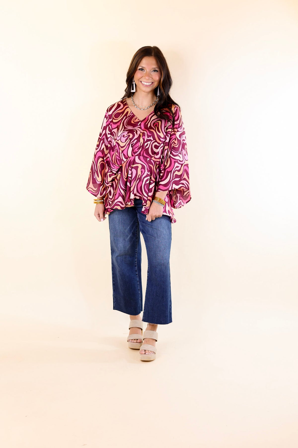 Hear the Music Drop Sleeve Swirl Print V Neck Peplum Top in Magenta Purple