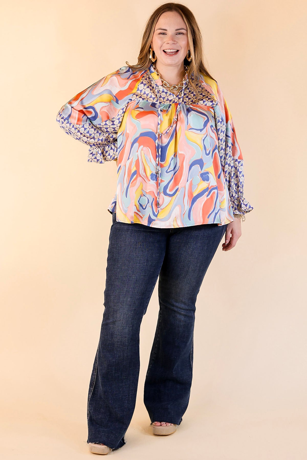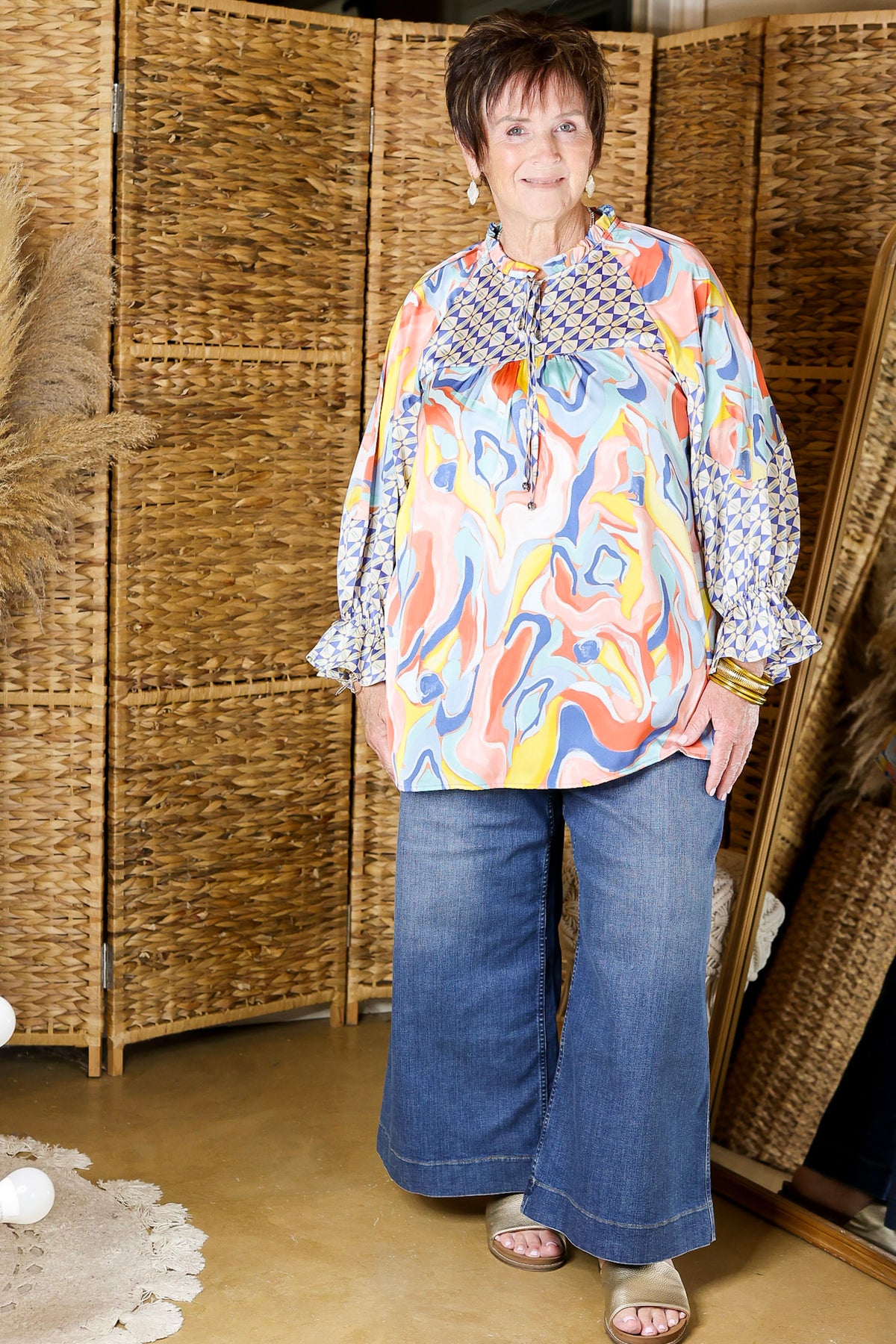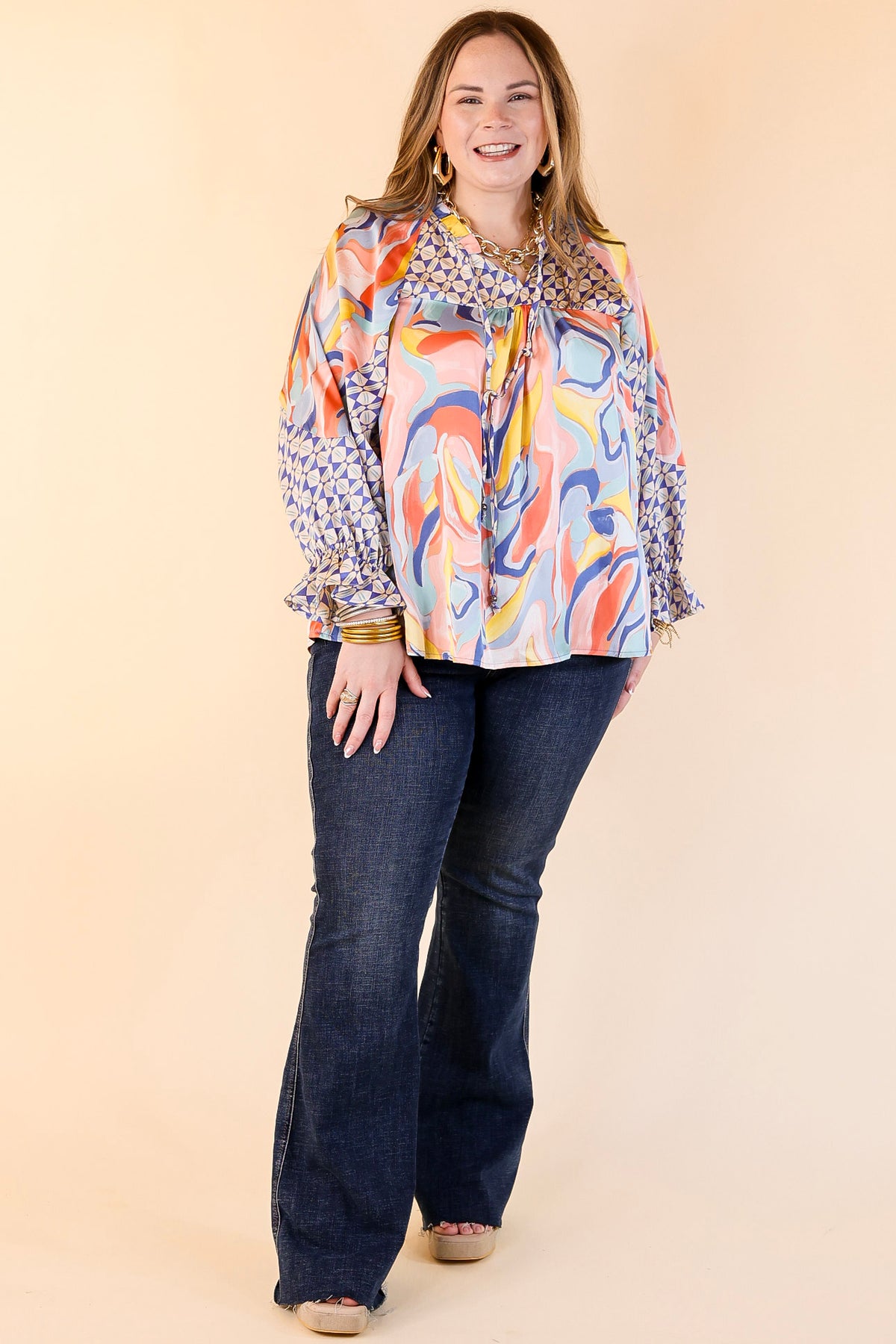 This new top will be keen on you! It includes a keyhole and tie neckline, 3/4 sleeves, and a mix of swirl and geometric prints. Pair it with some cut-offs or a pair of trousers and you're good to go!