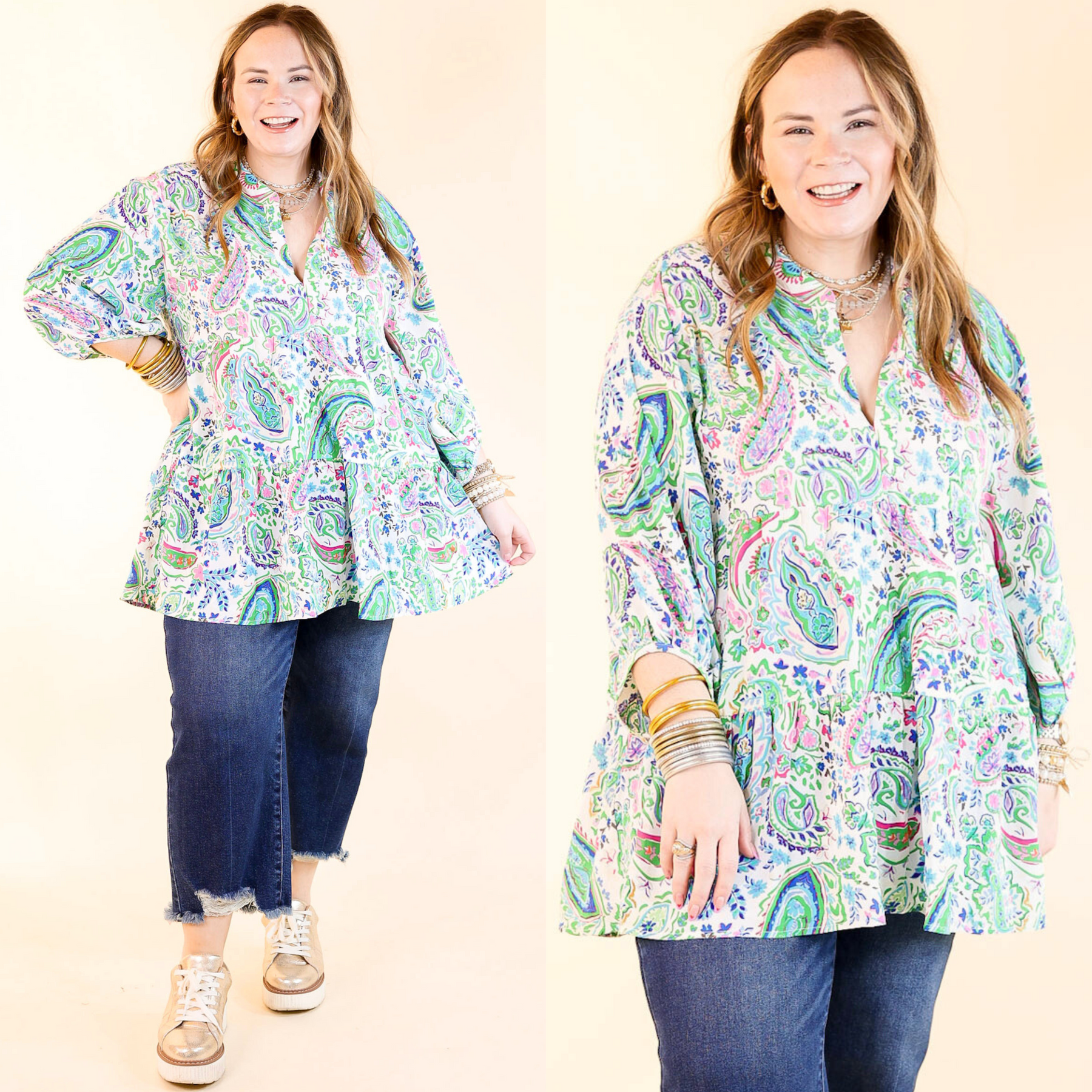 Introducing our 'Meadow Melody' top – a harmonious blend of style and comfort! This delightful piece features a flattering V neckline, a tiered babydoll body for a breezy silhouette, and roomy half sleeves. The star of the show is the adorable colorful paisley print, adding a touch of whimsy to your spring wardrobe. Embrace the melody of the meadow and make a statement with every step in this charming top. This top is a high-low top and will offer plenty of length to cover your back side.