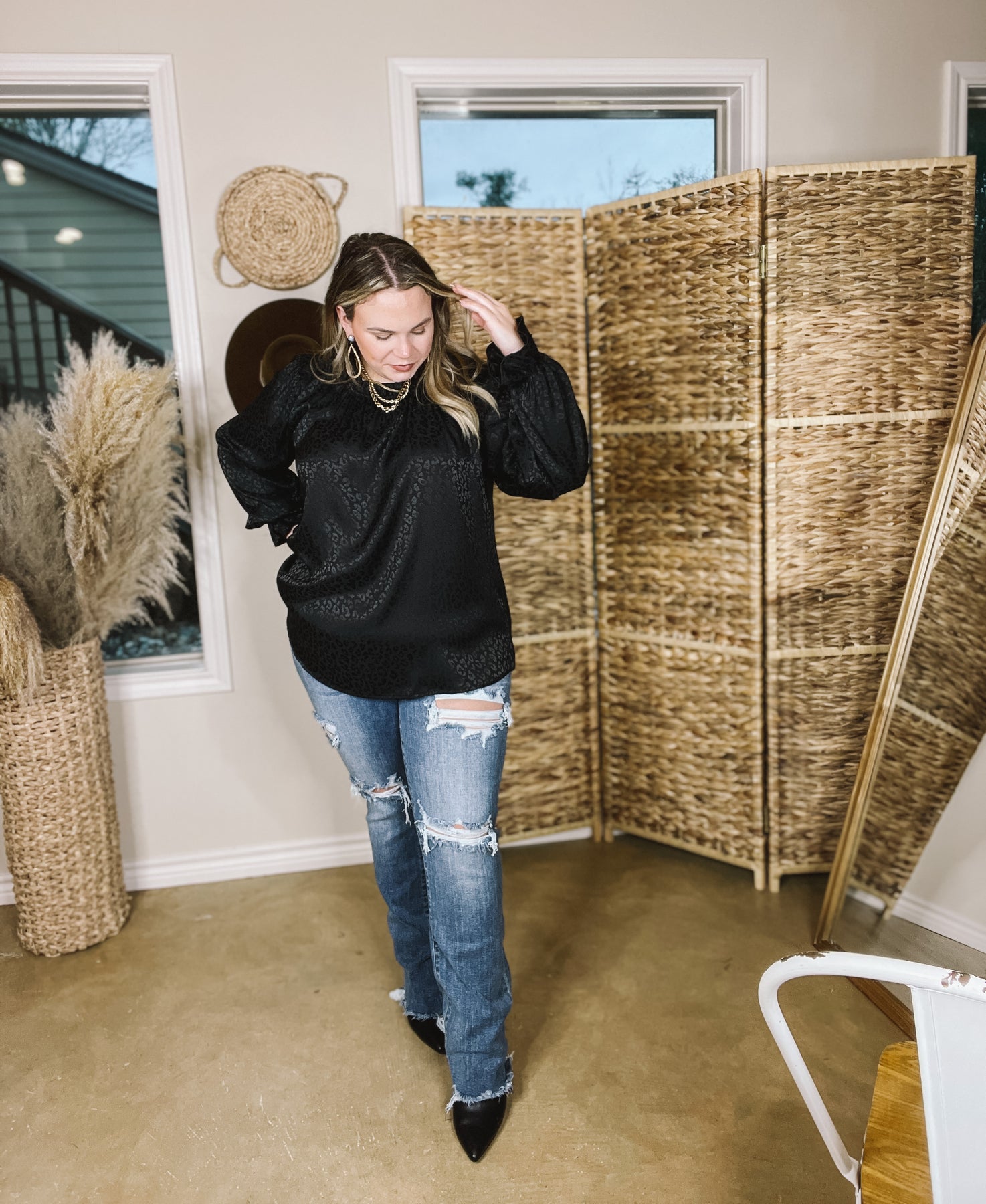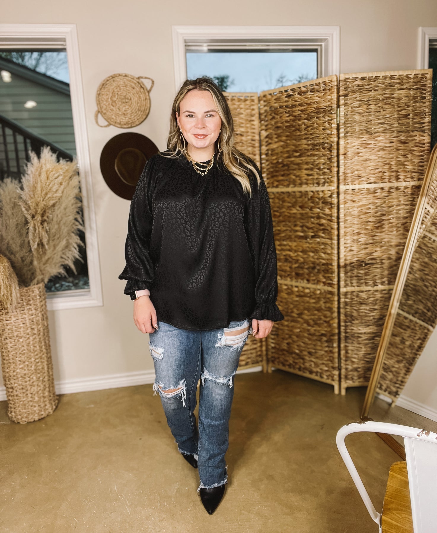 Mood Setter Ruffle Mock Neck Long Sleeve Leopard Print Satin Top in Black