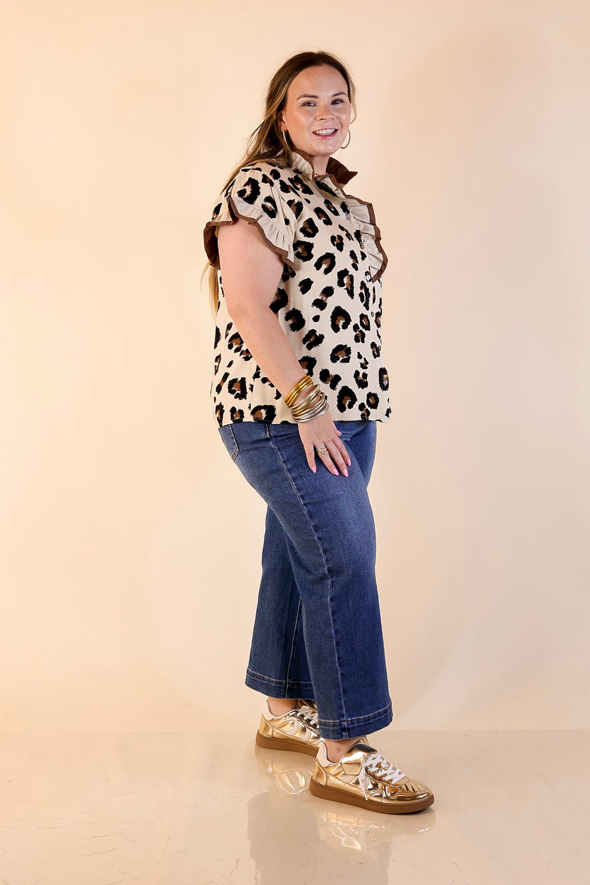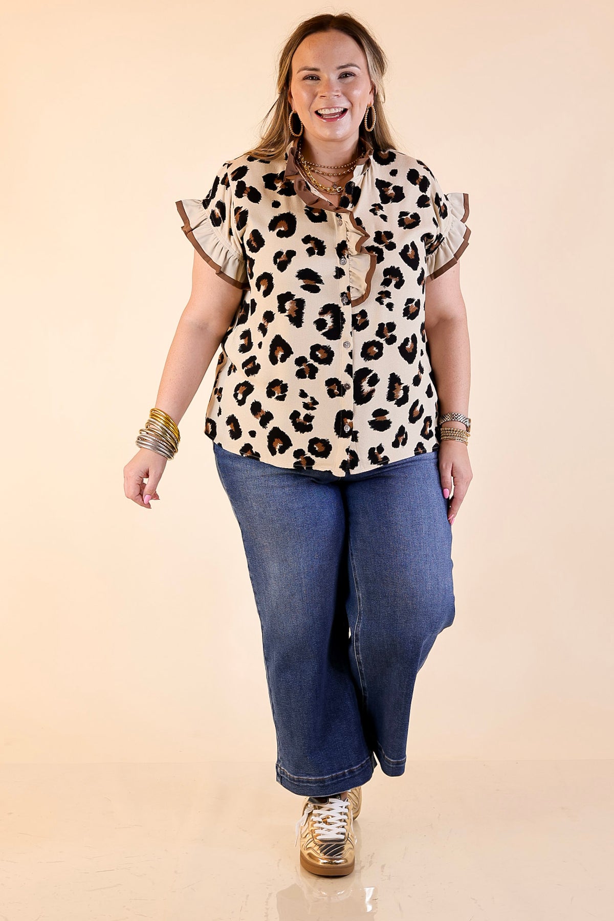 The Natural Charm Leopard Print Ruffle Trim Short Sleeve Top in Taupe is where classic print meets effortless femininity. Featuring a playful ruffle detail along the neckline and sleeves, this blouse brings a soft, stylish twist to your everyday look. The lightweight fabric drapes beautifully, while the button-front design adds polish without feeling fussy. Perfectly paired with jeans, trousers, or a skirt, this top transitions seamlessly from weekday wear to weekend outings — all with that signature GUG charm.