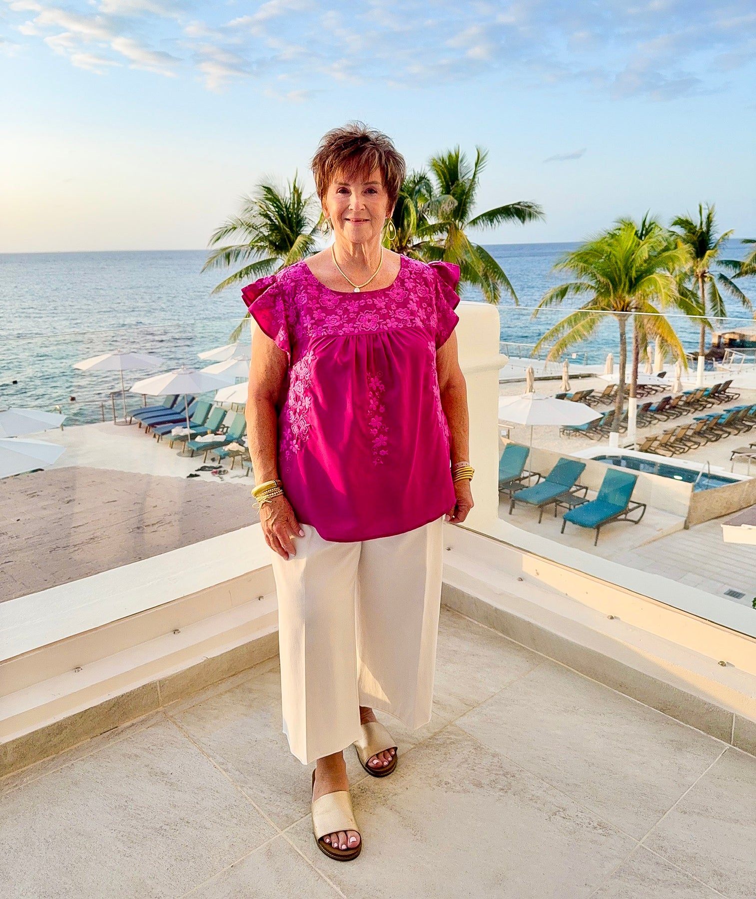 Get ready to shine this spring with our Picture Perfect top. Featuring a vibrant magenta floral embroidery that adds a burst of color, this top is perfect for your spring wardrobe. The round neckline and ruffle cap sleeves offer a flattering, feminine silhouette, making this top ideal for everything from brunch with friends to casual days out. Crafted from soft, breathable fabric, it combines comfort with style in the most effortless way. Pair it with jeans, skirts, or shorts for a look that’s as chic as it is easy.
