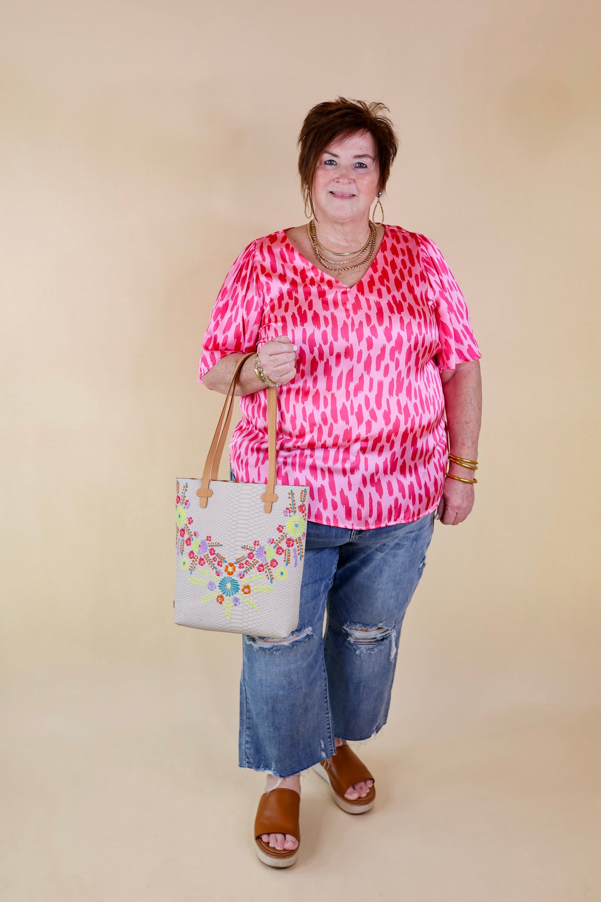 We are giving you more of our favorite print! This satin top is perfect for dressing up your look! It includes short flowy sleeves, a v neckline, and a slight a-line body. Pair this with skinnies and booties for a cute look this season! Nancy is wearing a size 2XL.