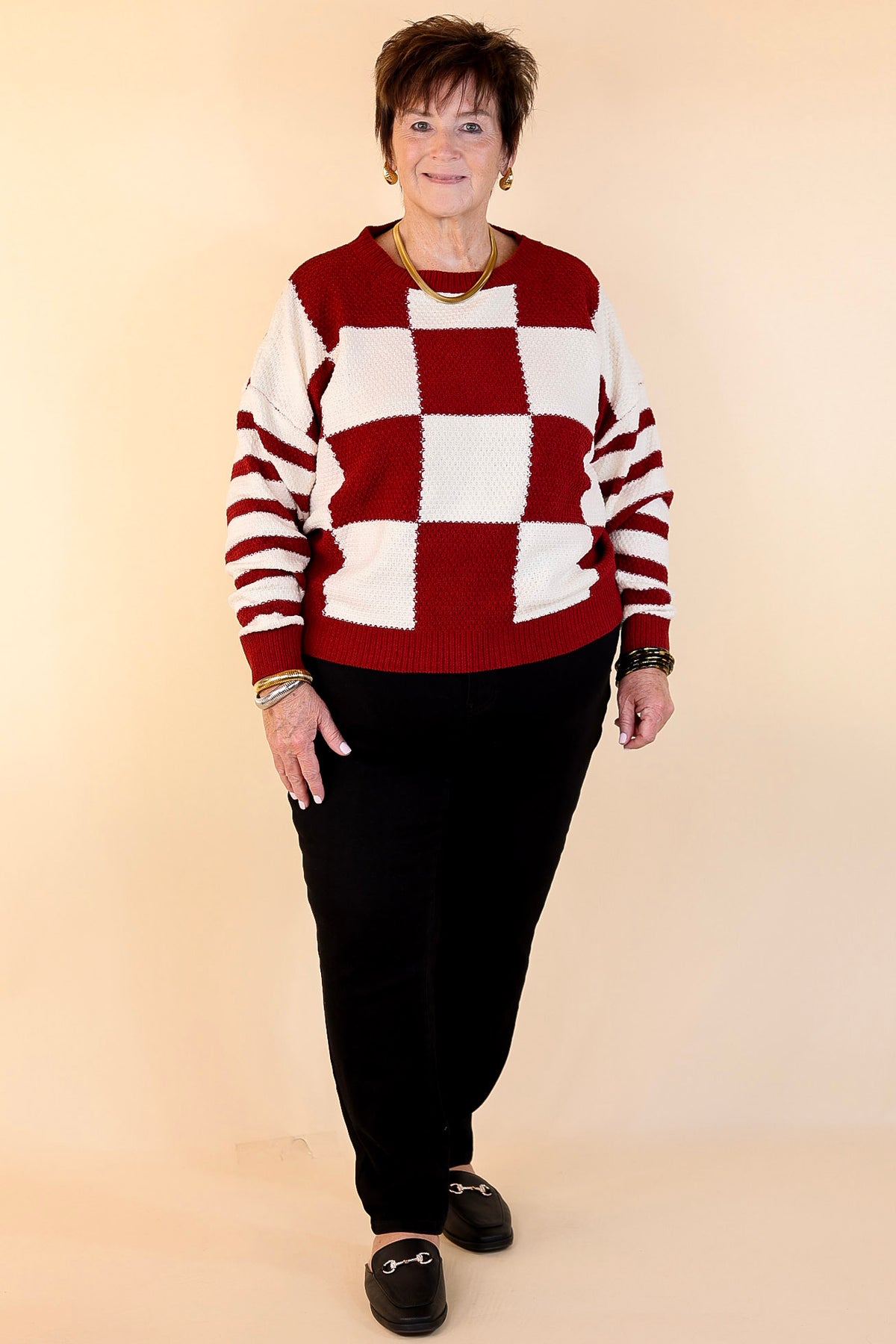 Introducing the Split Decision Sweater, your new go-to for standout style and cozy comfort. Crafted from an ultra-soft material, this long-sleeve sweater features a classic crew neck design. The unique combination of patterns makes it a true statement piece—showcasing a bold checkered print on the front and contrasting striped patterns on the back and sleeves. Elevate your everyday look with this dynamic mix of prints, designed to keep you stylish and warm all season long. Pair it with your favorite jeans or trousers for an effortlessly chic outfit.