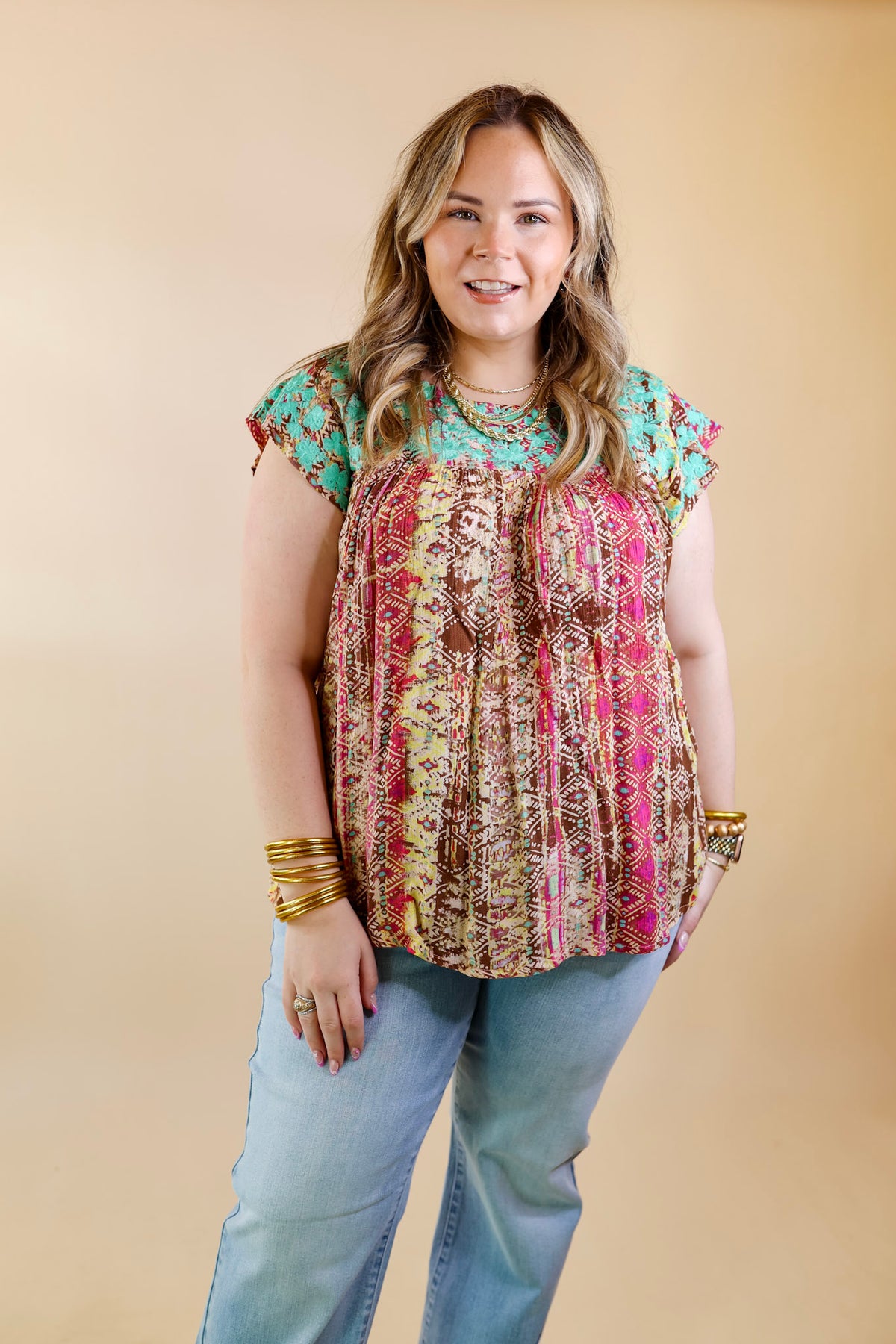 Last Chance Size Small | Festival Weather Turquoise Embroidered Tribal Print Top with Cap Sleeves in Olive Green Mix