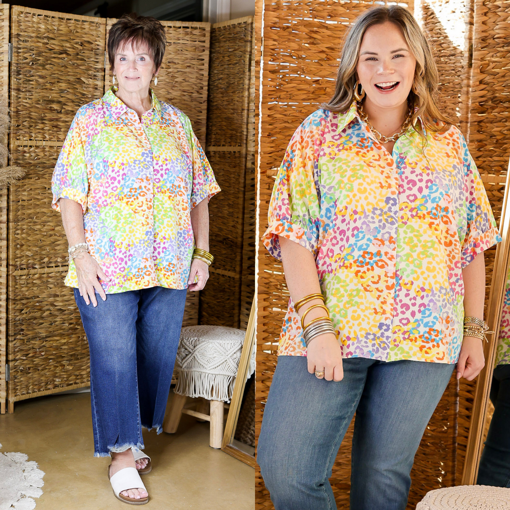 Introducing our "Vibrant Vision" top, a chic blend of sophistication and bold style. With its collar, button-up design, and eye-catching poncho-style sleeves, this top is a true standout. Crafted from high-quality fabric, it offers comfort for all-day wear. The striking cheetah print pattern in vibrant colors adds an energetic touch to any outfit. Pair it with jeans for a casual look or dress it up with tailored trousers.