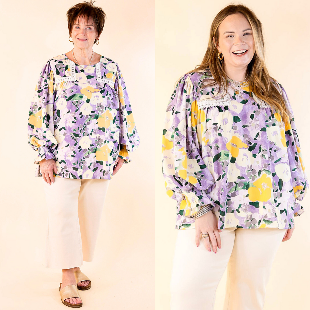 Destination Obsessed Crocheted Detail Floral Long Sleeve Blouse in Lavender