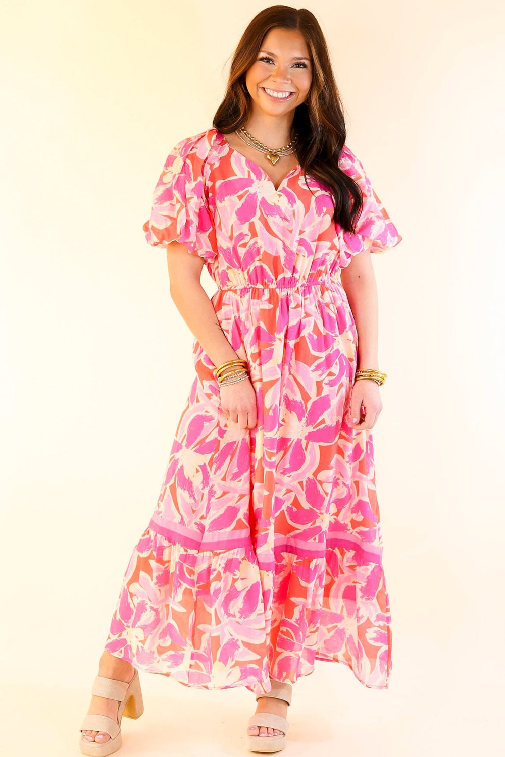 Forever Fabulous Floral Print Tiered Maxi Dress with Puff Sleeves in White/Pink